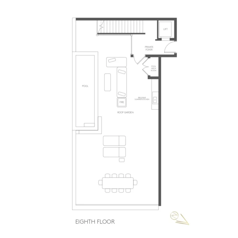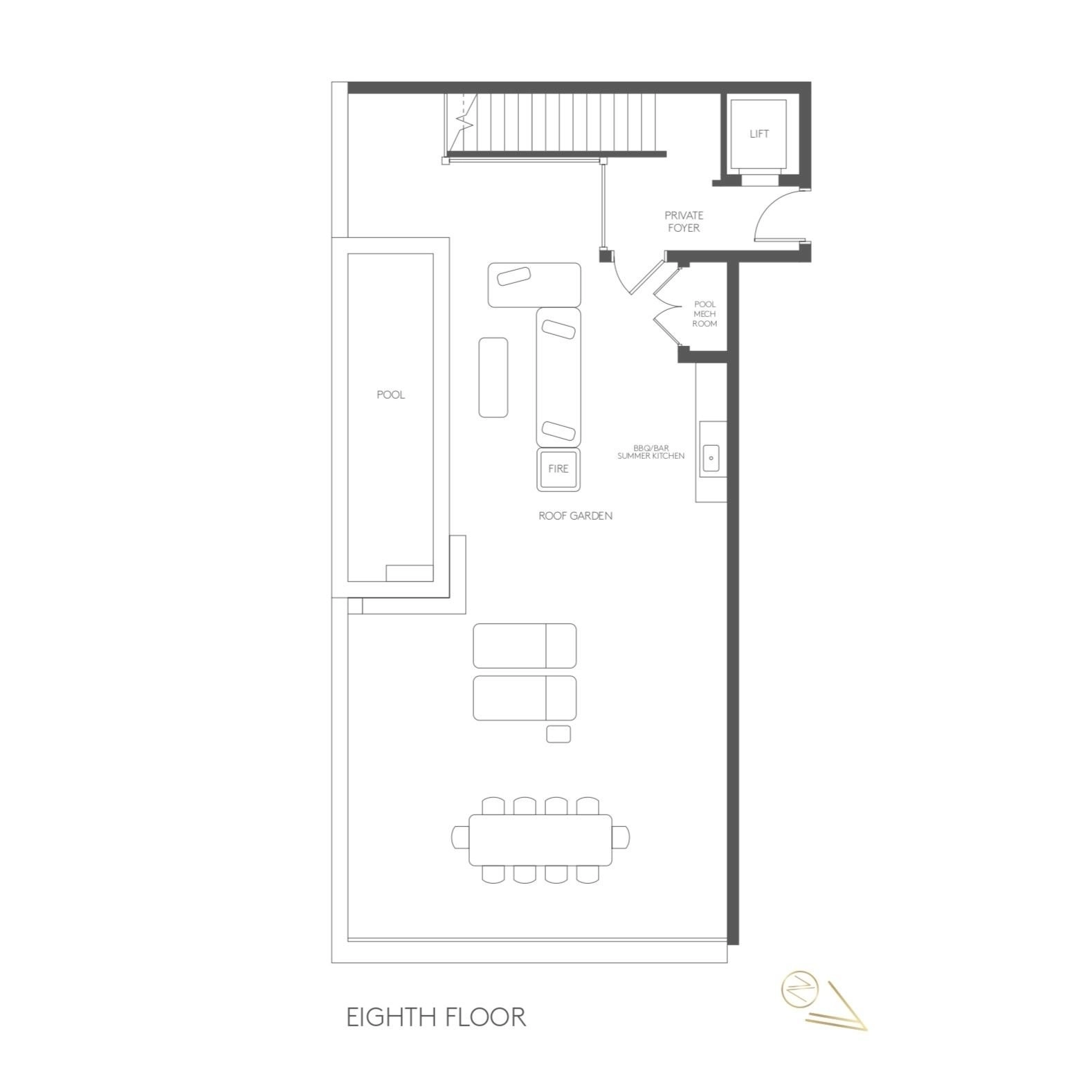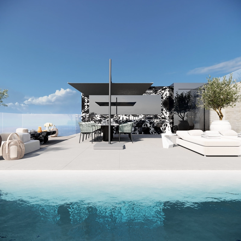 • Private rooftop garden with infinity pool and signature marble-topped bar