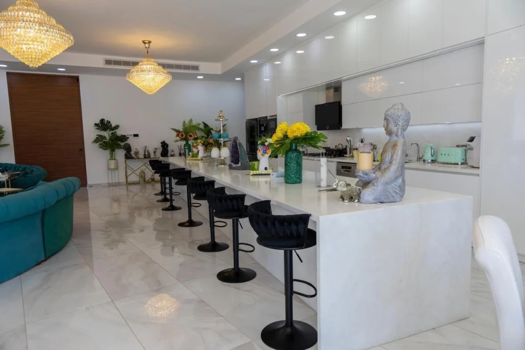 For sale a seven-bedroom villa of 1,350 m2 on a plot of 6,000 m2 in the area of Parekklisia, Limassol. The villa includes 7 bedrooms, of which 5 bedrooms with private bathrooms and large walk-in closets, 1 guest bedroom and 1 staff room, as well as living and auxiliary rooms. The property is equipped with a photovoltaic system. Additionally, there is a separate kiosk on the street with a barbecue area and a kitchen, a storage room, and a parking garage. There is a 530 m2 saltwater swimming pool with a Jacuzzi, a mini football field and a well-maintained garden with fruit trees yielding a variety of fruits.