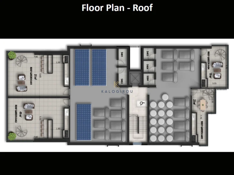 Apartment situated on the fourth floor for sale in Livadia area, Larnaca. It consists of a kitchen, living & dining area in open layout, one bedroom, a bathroom (with shower), covered veranda and roof garden. Moreover, the apartment has allocated covered parking on the ground floor and storage on the roof top.