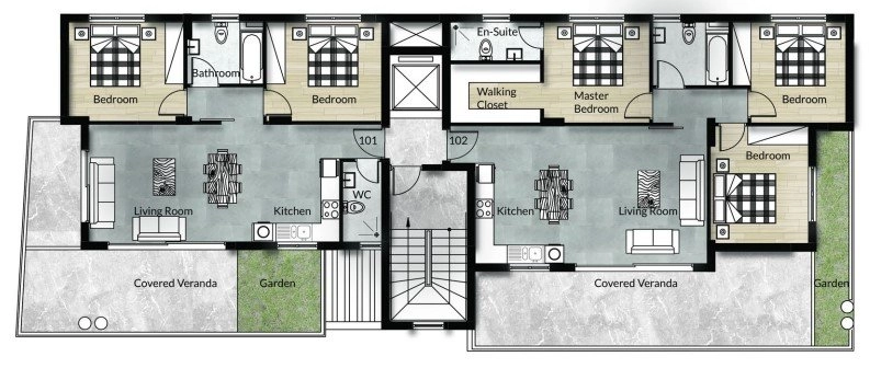 The project is intentionally limited in scale, comprising just six thoughtfully planned apartments. Spacious two- and three-bedroom residences are designed with an emphasis on proportion, natural light, and everyday comfort, reflecting a contemporary aesthetic that feels both practical and understatedly elegant.