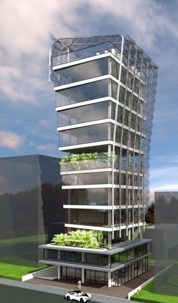 The building consists of seven floors of office space, along with two underground parking levels, a ground floor with shops and a reception area, and a roof terrace.