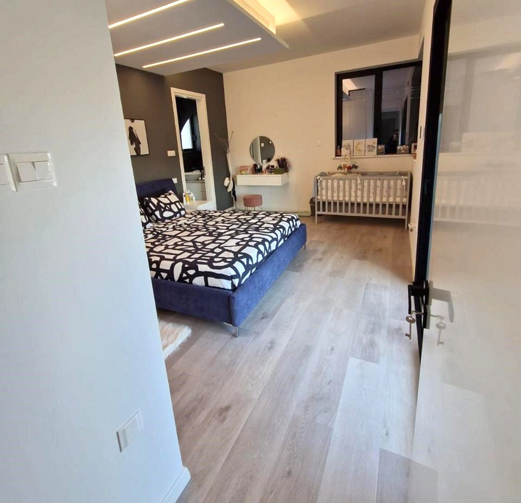 All four bedrooms are located on the upper floor, including a master suite with an en-suite bathroom and a walk-in wardrobe. The remaining bedrooms share a second stylish bathroom, while a dedicated laundry room completes the upper level.