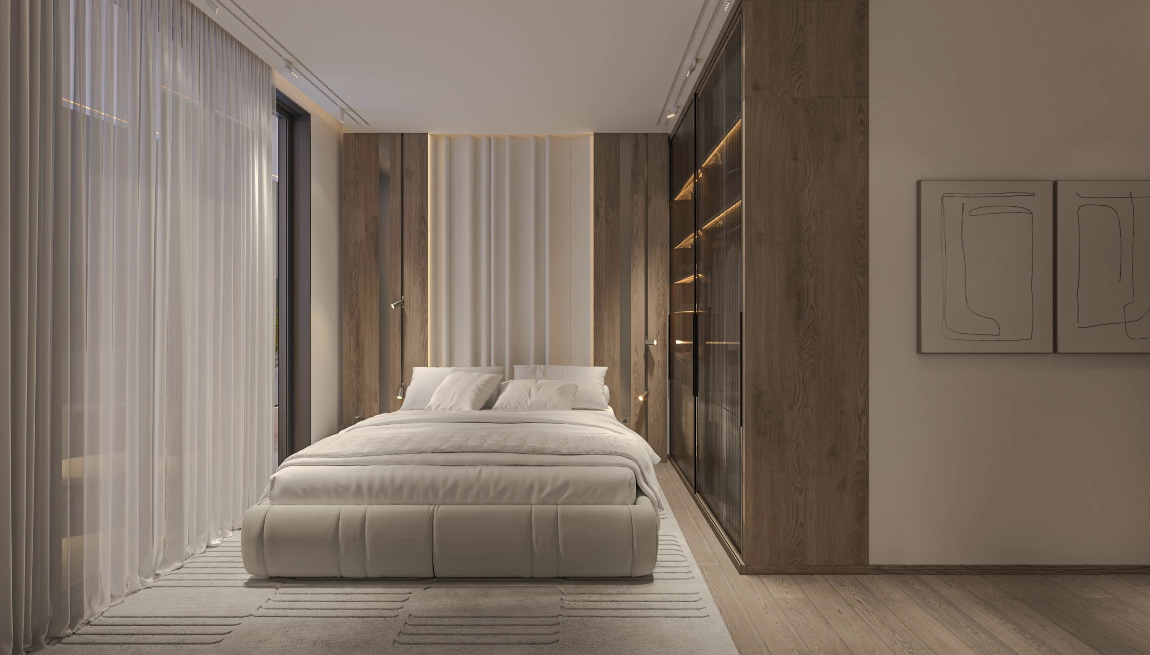 The master bedroom is generously sized, easily fitting a large bed and additional furniture, and includes built-in wardrobes for practical storage. It provides a quiet and restful environment away from the main living areas.