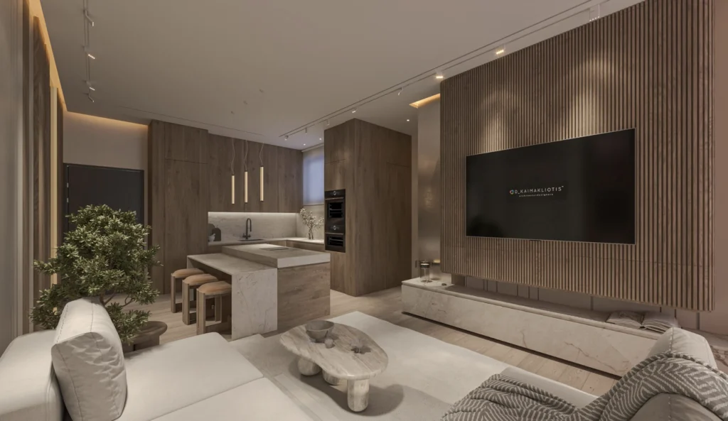 The two-bedroom apartment offers a well-balanced layout that combines comfort, privacy, and versatility. The open-plan living and dining area forms the heart of the home, offering plenty of room for both everyday living and entertaining guests. Large windows and glass doors enhance the sense of space and brightness, while the covered veranda extends the living area outdoors.