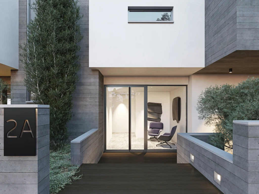The property is part of a modern residential development built with clean architectural lines and high energy-efficiency standards (Energy Class A). The layout maximizes natural light and connects the indoor living space with a spacious covered veranda, creating a functional extension of the home. The veranda includes a built-in BBQ area, ideal for private outdoor living.