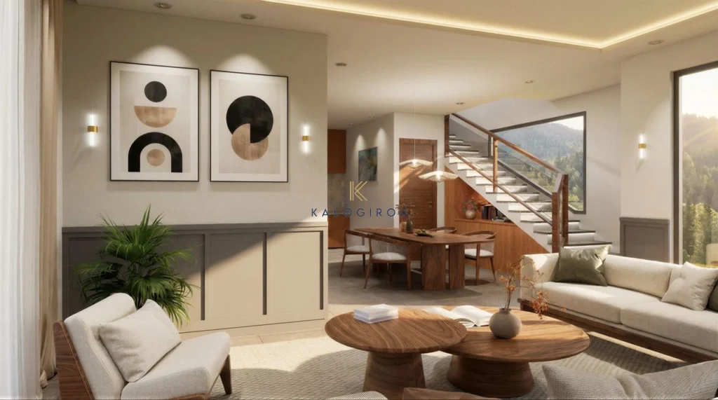 Detached, Three Storey House in Mazotos, Larnaca. The ground floor welcomes you with a bright open-plan living, dining, and kitchen area, along with a guest toilet. A staircase leads to the first floor, which features two comfortable bedrooms and a family bathroom and there is another one floor with a third bedroom.