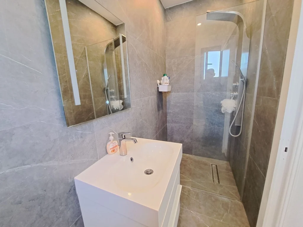 The house consist on the ground floor a spacious open plan living area, a separate kitchen area, a guest room and a guest WC/shower. On the ground floor there is also a wood burner and a store room under the staircase.