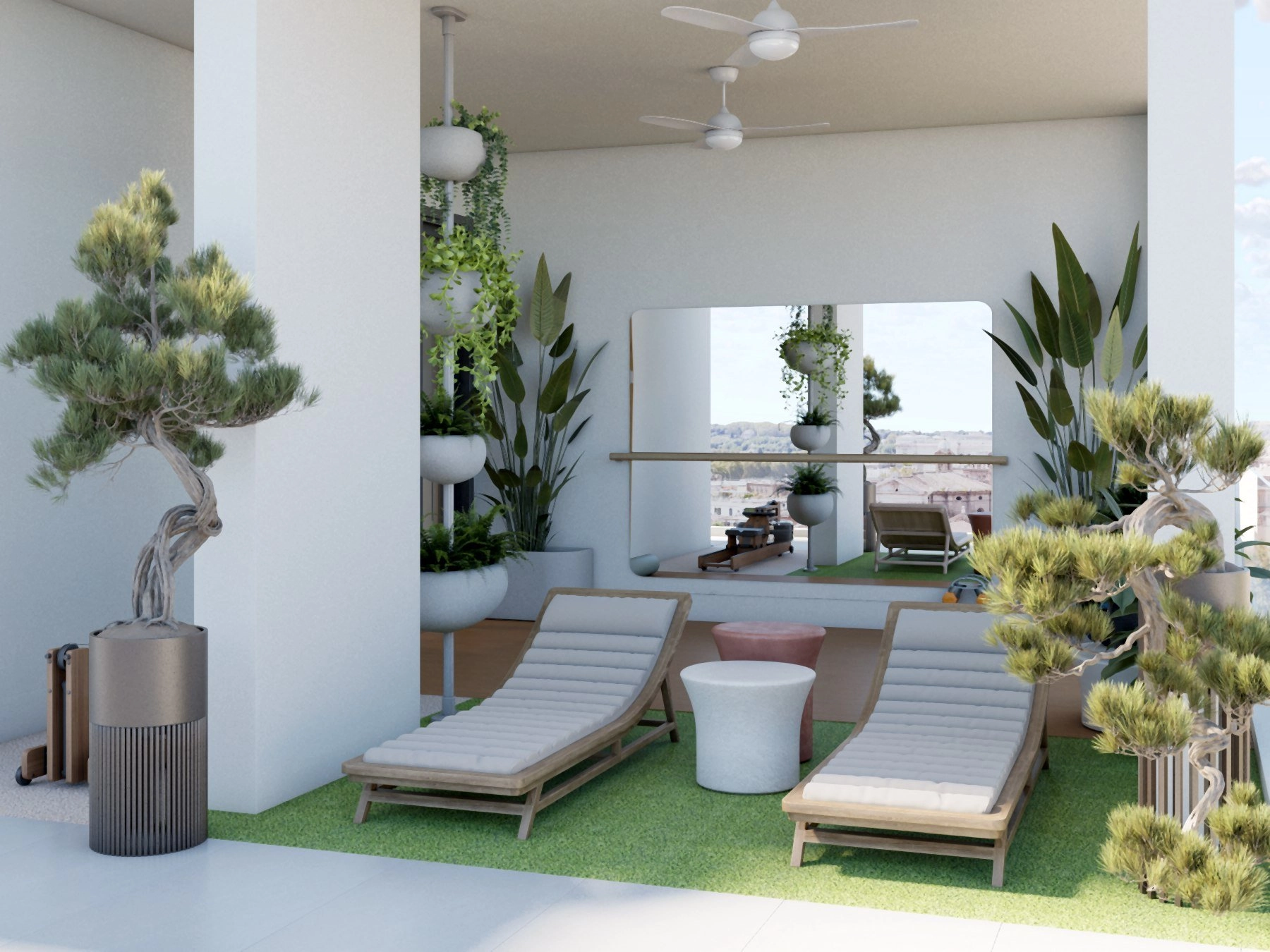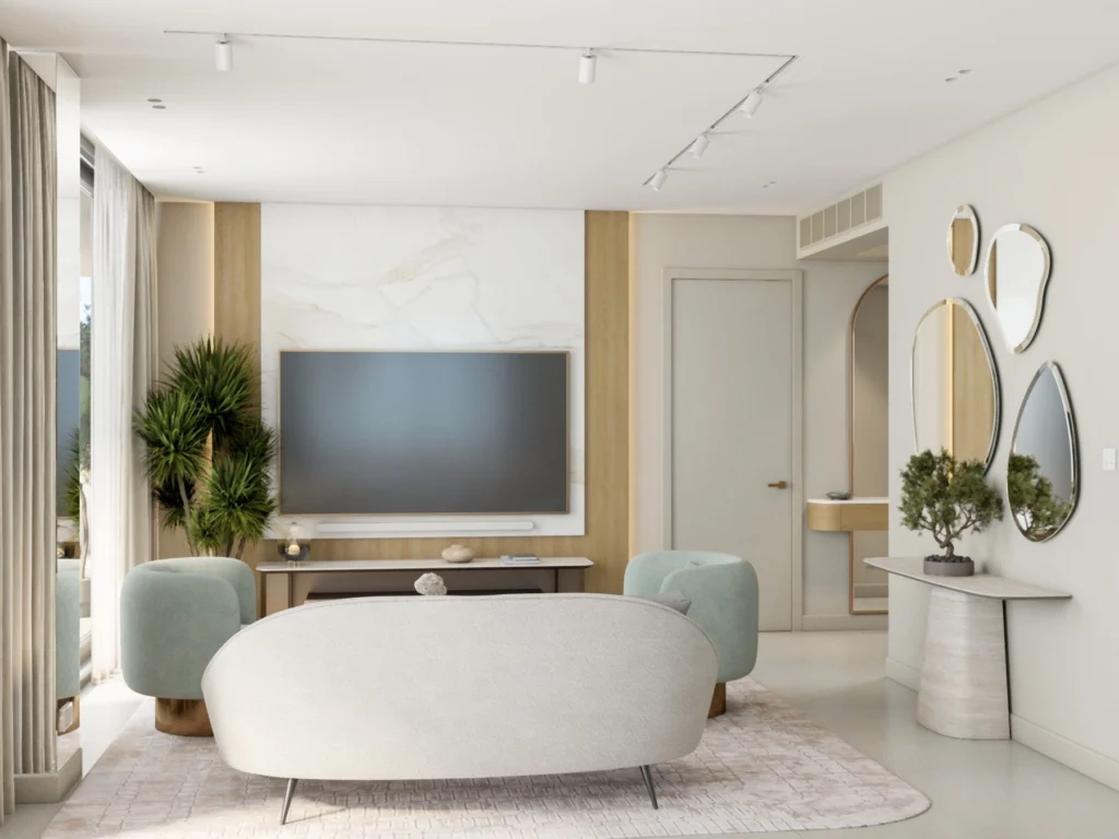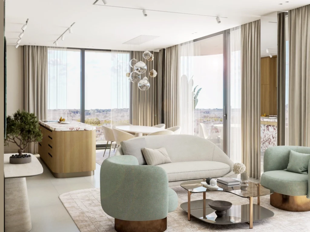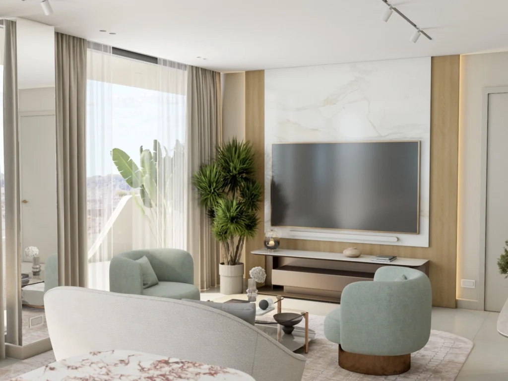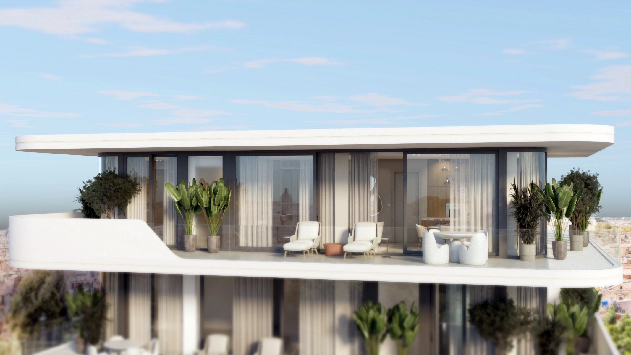 The residence unfolds as a seamless composition of expansive living spaces, panoramic glazing and refined materials. Floor-to-ceiling windows frame open city and coastal views, while generous terraces extend the interiors outward, creating a natural flow between indoor elegance and open-air living. Every surface reflects uncompromising quality: bespoke carpentry, premium stone finishes, designer sanitary ware, concealed climate systems and underfloor heating, integrated smart-home automation and individual photovoltaic efficiency.