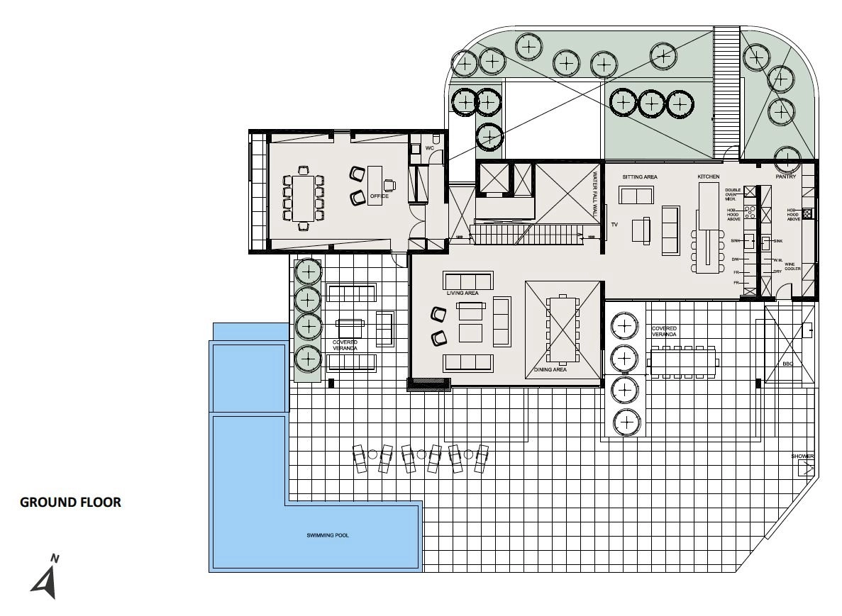 The villa is designed on three levels (basement, ground floor, and first floor). The villa enjoys its own private swimming pool surrounded by an outdoor barbecue area, spacious indoor and outdoor areas.