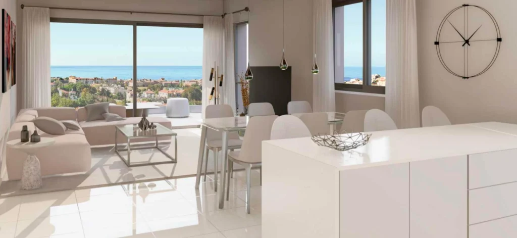 Apartments for sale in the area of Chlorakas, Paphos in a gated complex with a swimming pool, overlooking the sea and a 2-minute walk to the sea. There is a parking space for the car. The complex has a restaurant, a bar, a health club with a gym, a sauna, a steam bath, a beauty salon, an infinity pool overlooking the Mediterranean Sea, a tennis court, a children’s playground, as well as natural paths and trails.