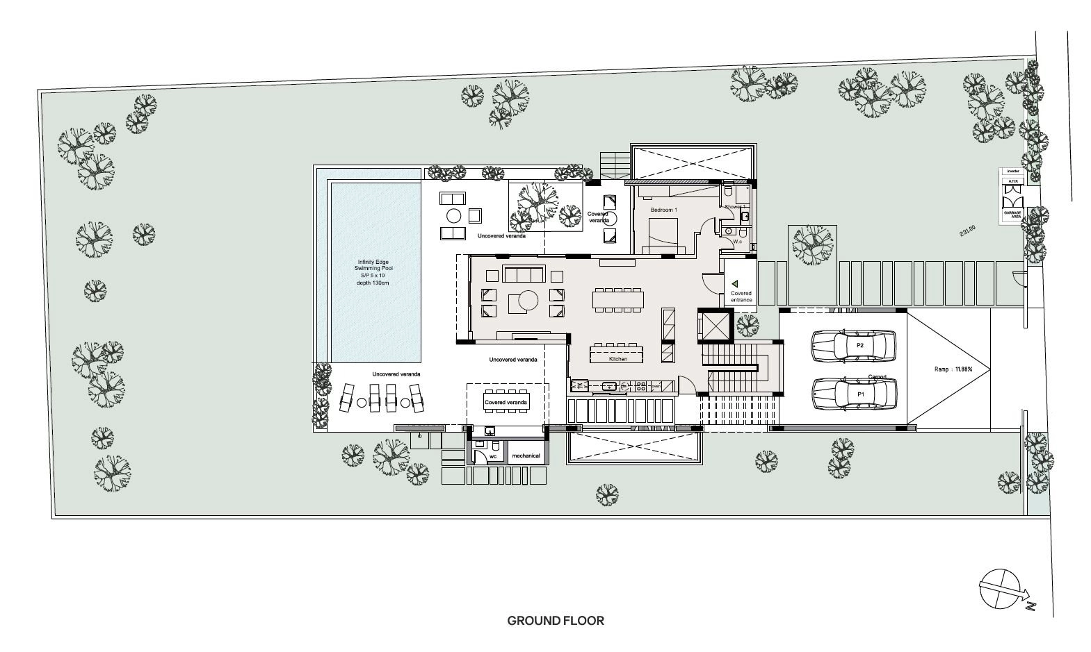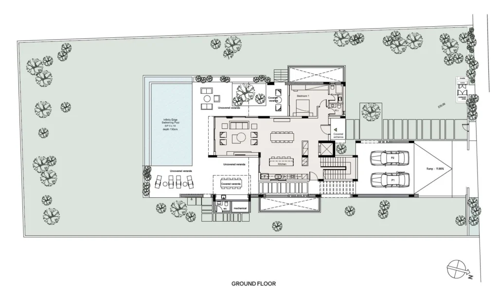 The villa is designed on three levels (basement, ground floor, and first floor).