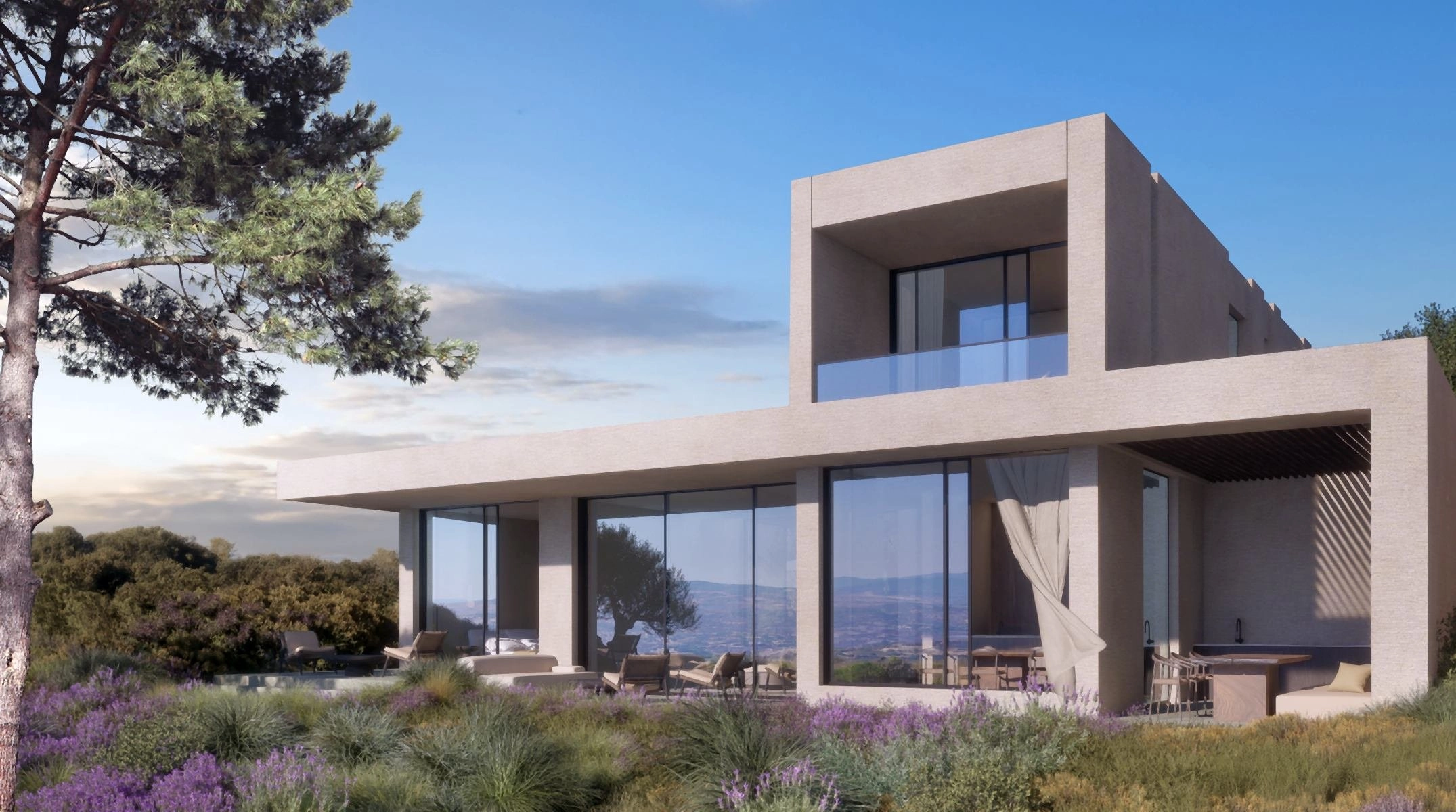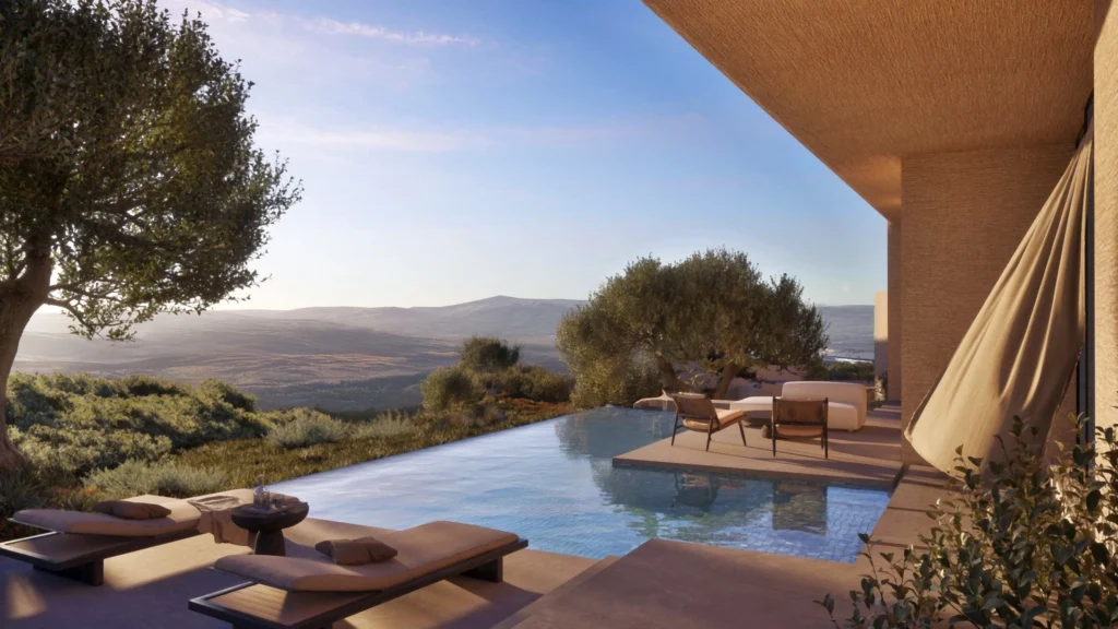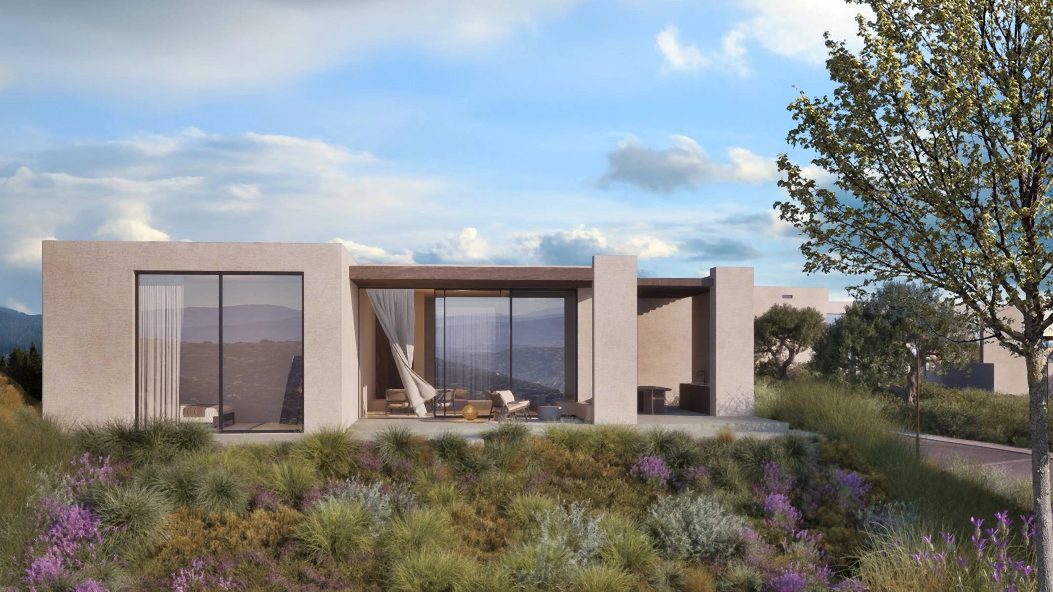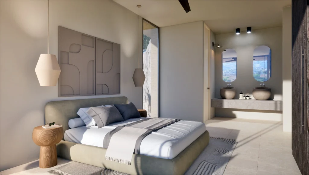 The masterplan introduces a carefully curated collection of residences, including contemporary apartments, elegant duplexes, single-level villas and expansive two-storey homes. Architecture follows a clear principle: reconnecting indoor spaces with the surrounding landscape. Open-plan interiors, generous terraces and floor-to-ceiling glazing frame the scenery as a living artwork, while natural materials and restrained detailing create a calm, refined atmosphere.
