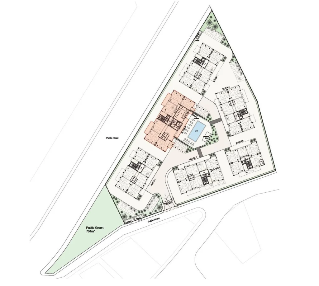 An exclusive gated community comprised from six luxurious blocks is surrounded by lush greenery, boasting modern amenities with intention to offer a well-balanced lifestyle to its residents. Located near the captivating Limassol :salt lake and the Lady’s Mile beach, this quiet residential area in Limassol, Asomatos promotes fine, healthy and high-quality living. A wide choice from 105 units, including studios and 1-2 bedroom apartments, with high-quality finishes.