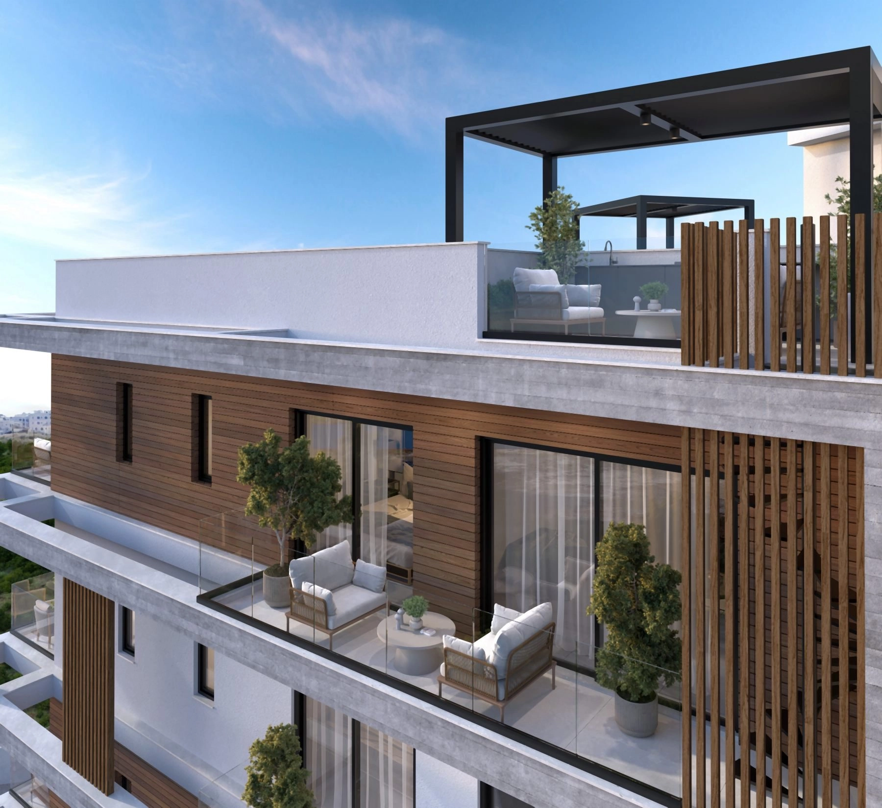 The architectural concept emphasizes clean lines, generous openings, and carefully proportioned interiors filled with natural light. Select residences on the upper level benefit from private roof gardens, creating an additional layer of outdoor living and a sense of rare urban retreat.