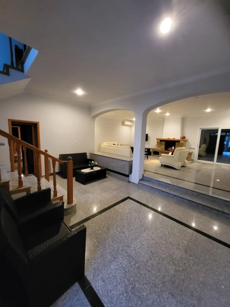 This elegant two-story house with an extra basement area is situated on a 1000 sqm plot in the prestigious Kalogiri area of Limassol. The area is known for its tranquility and prestigious neighbours, as well as its proximity to all necessary amenities. Elite schools, shops, pharmacies, and cafes are just a few minutes’ drive away. The property offers stunning views of the sea, the mountains, and the city. All the elegantly furnished and equipped areas of the house, including four bedrooms, the living room and the kitchen, are fitted with air conditions to ensure comfortable climate year-round. In winter months you will appreciate two cozy fireplaces, one in the living room and one in the hall upstairs, and the central heating system. The villa features a pool area with a dressing room, shower, wc, and a pool bar, a barbecue area, and a large garden with fruit trees, creating perfect conditions for outdoor relaxation. A covered 1-vehicle parking and a spacious uncovered area for 7 cars add extra convenience. The property has been fully renovated in 2018 and comes fully furnished and equipped with all necessary household appliances.