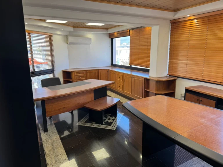 Office space for sale with a total area of 190 m2 in the Town Center Limassol area, Limassol city. The office includes a main work room for 6 workstations, a separate small office for 2 workstations, an additional workspace on the second level for 3 workstations, a kitchen, a bathroom, a pantry and a separate private office. The total area of the facility is 190 m2, of which 118 m2 is occupied by the lower level, the upper level is 67 m2, the remaining area is devoted to the kitchen and bathroom. The building was built in 2000. The room is equipped with a safe, the kitchen and bathroom are fully functional. On the ground level there is a main office, a kitchen, a private office, a pantry and a toilet, the second level is used as an additional office area.