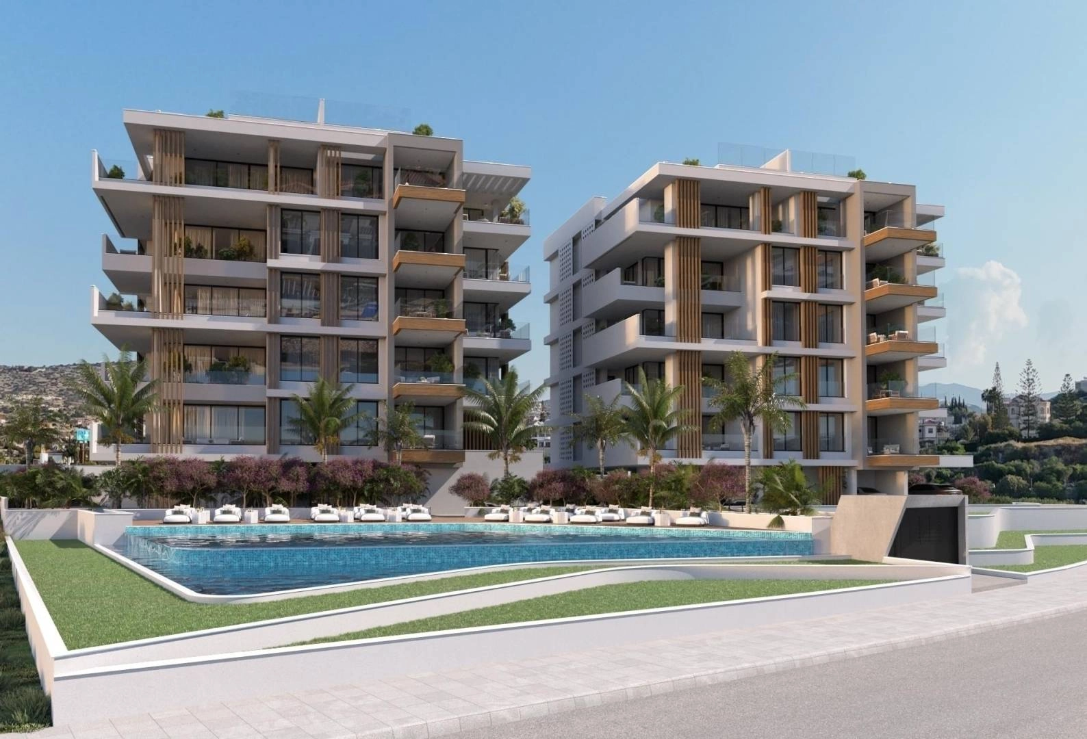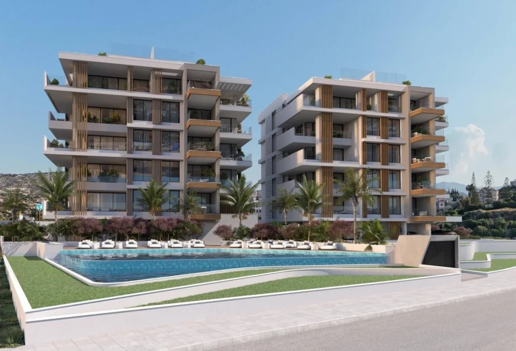A modern residential complex consisting of two 5-storey buildings with a large swimming pool with changing rooms and a beautiful landscaped garden. Each building consists of seven 2-bedroom apartments, four 3-bedroom apartments and two unique 3-bedroom penthouses with private pools, roof gardens and stunning panoramic sea views. This is a luxurious modern complex located in the tourist area of Limassol, just 200 meters from the sandy beach. Excellent location, close to all amenities and the best 5-star hotels in Limassol. It will be built to the highest standards and specifications, using the highest quality materials from well-known manufacturers. Without exception, all apartments are spacious, well-planned, with large verandas and designed in such a way as to provide maximum space and comfort. Each apartment has a private parking and a storage room.