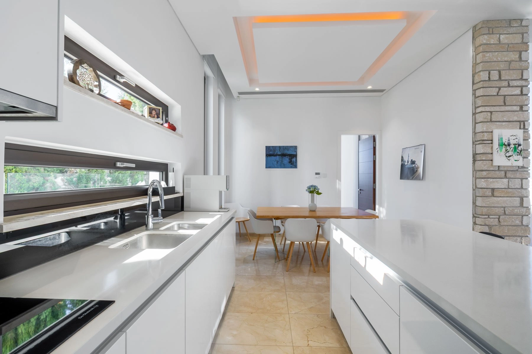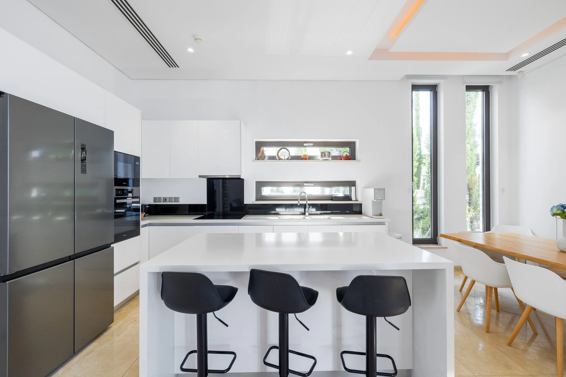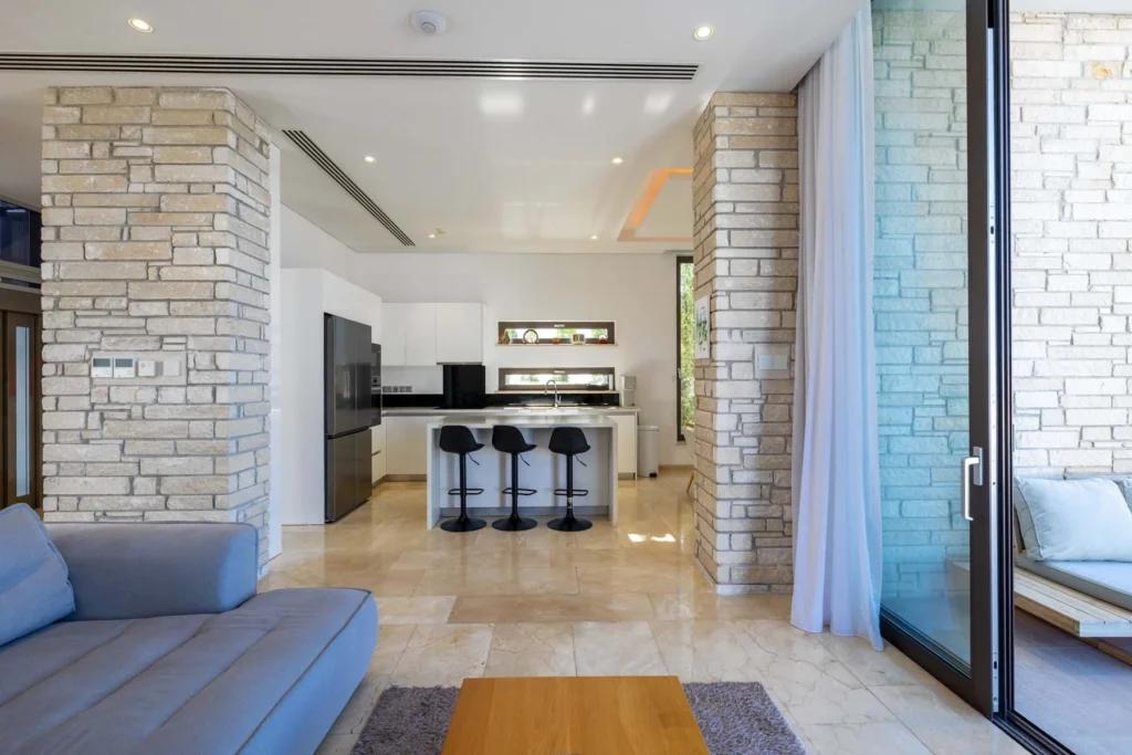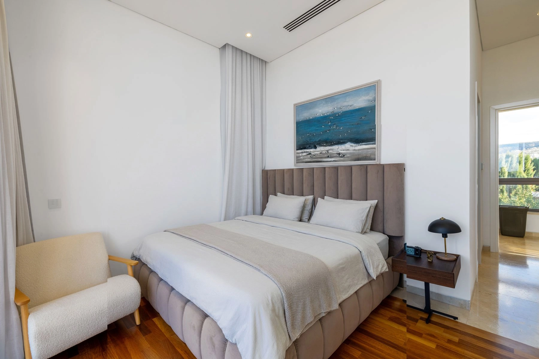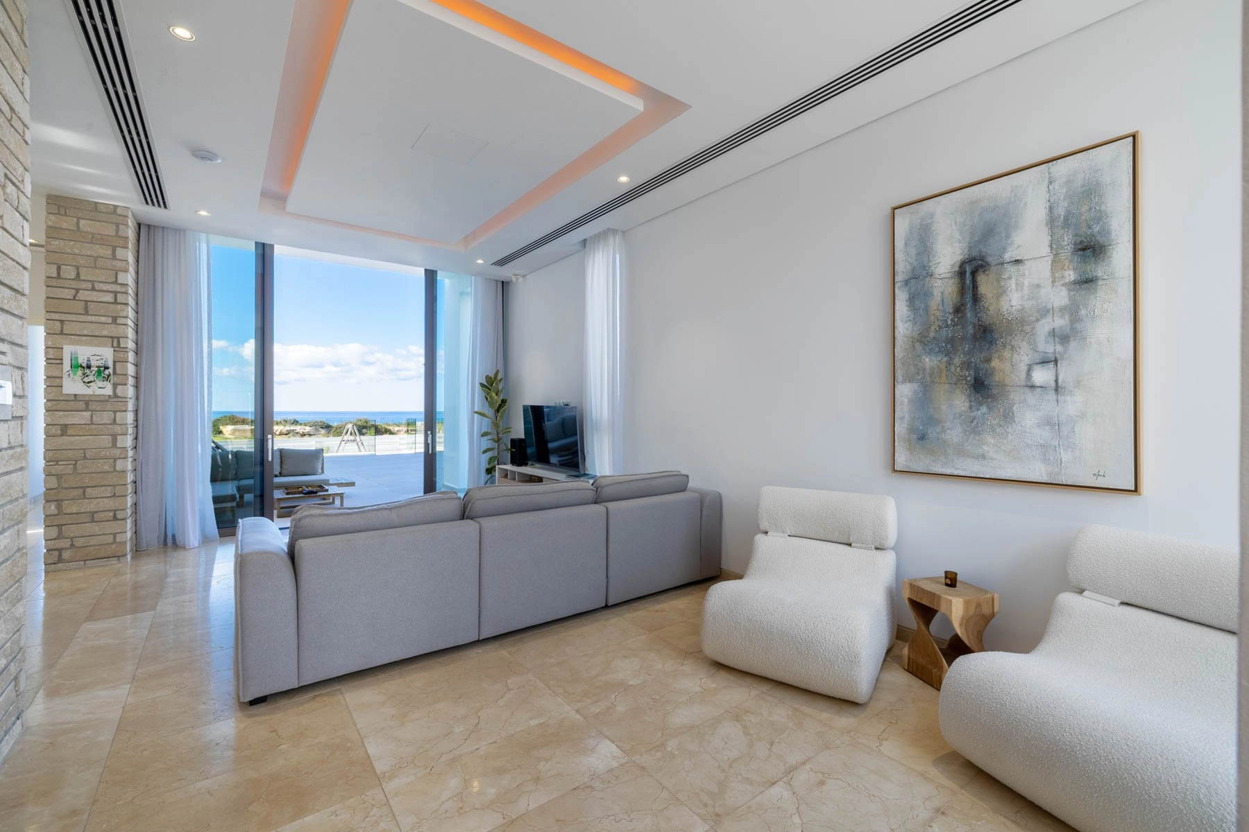 Set within one of Cyprus’s most prestigious seafront resorts, this elegant corner villa enjoys an exceptional position with uninterrupted views of the Mediterranean. The residence occupies a generous private plot, framed by a beautifully maintained garden and complemented by a striking private swimming pool measuring 15 by 5 meters — an unusually spacious design that creates an impressive focal point for outdoor living. A leisure area and open-air kitchen complete the setting, perfectly suited for relaxed coastal days and long evenings by the water.
