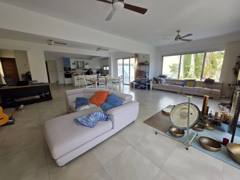 Three-bedroom office villa for sale in Konia, Paphos. The villa is located on a plot of 600 m2, the total area of the property is 240 m2. It is fully furnished and equipped with modern appliances, including a refrigerator, dishwasher and washing machine, an equipped kitchen with an island. Central heating, air conditioners and fans are installed in all rooms. There are three bedrooms (two of which can be separated from the common area and have a separate exit), two bathrooms and a guest toilet. There are 120 m2 of open space for coworking, a living room with a fireplace, a Smart TV, two balconies with access to the street, a barbecue area and a relaxation area in the garden. The villa is located in a gated complex with a beautiful garden and scenic views of the canyon, security, alarm system, storage room and parking are provided: covered for 2 cars and one open space. Year of construction — 2015, energy efficiency class — A. Excellent location, all infrastructure within walking distance.