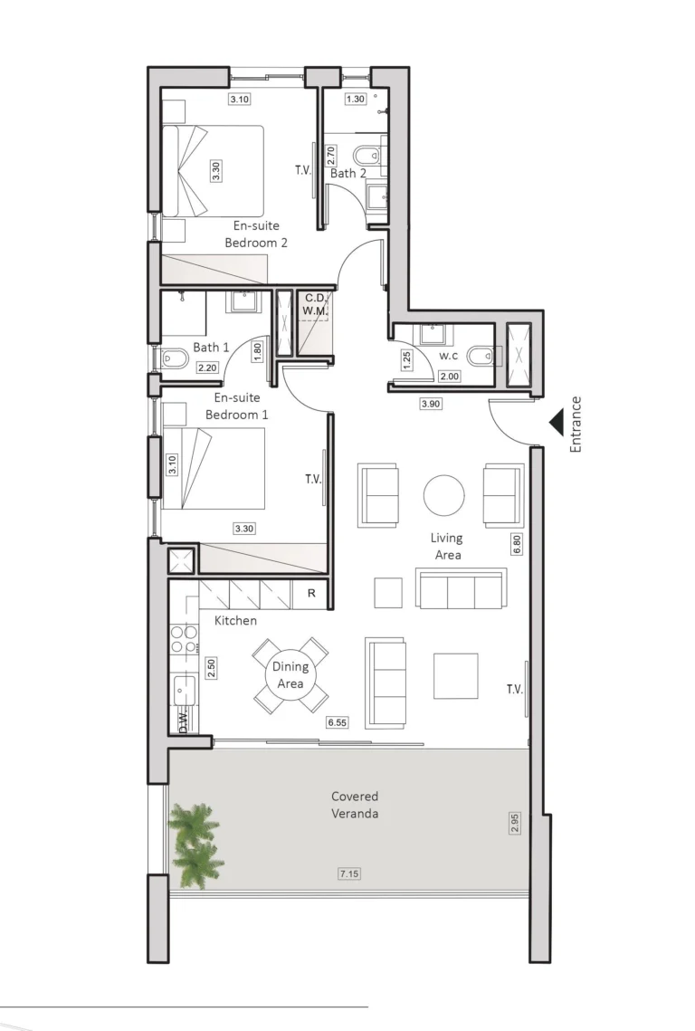 This modern two-bedroom apartment is located in a contemporary residential complex just 400 meters from the coastline in Larnaca, offering an ideal combination of convenience, lifestyle, and coastal living.