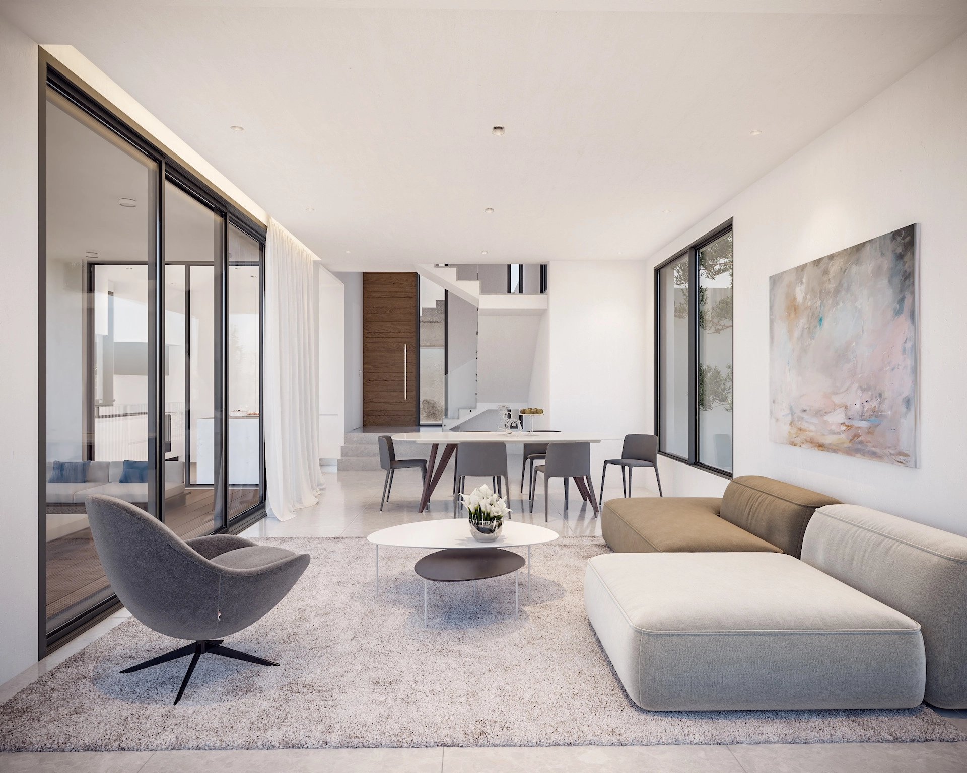This contemporary villa is set on a generous private plot and features well-designed living spaces filled with natural light. The open-plan living and dining area creates a welcoming atmosphere, ideal for both everyday living and entertaining guests. Large verandas extend the living space outdoors, allowing residents to enjoy the Mediterranean climate and the serene surroundings.
