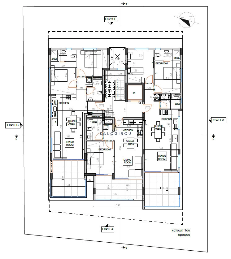 Apartment situated on the third floor for sale in Krasas area, Larnaca. It consists of an open space kitchen-living-dining area, two bedrooms, master bedroom en suite with walk-in shower, main shower room, front sided covered veranda and roof garden. The roof garden has open kitchen and shower room. Additionally, the apartment has access to a storage room and covered parking on the ground floor.