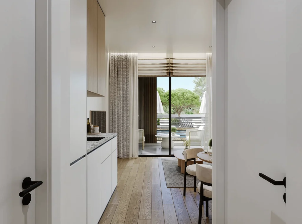 The one-bedroom apartment offers a stylish and practical living space designed for modern lifestyles. The open-plan layout connects the living room, dining area, and kitchen into a bright and functional environment.