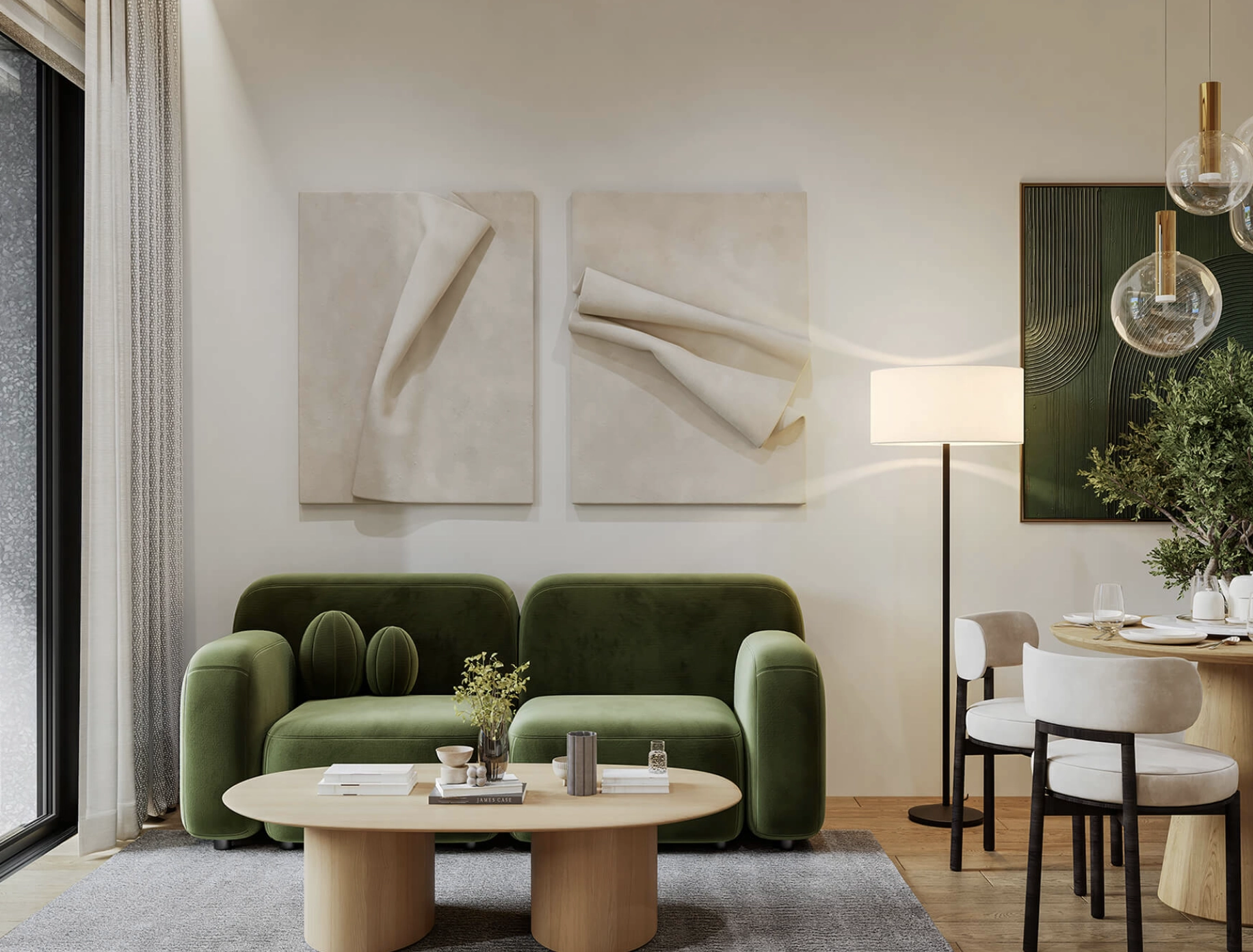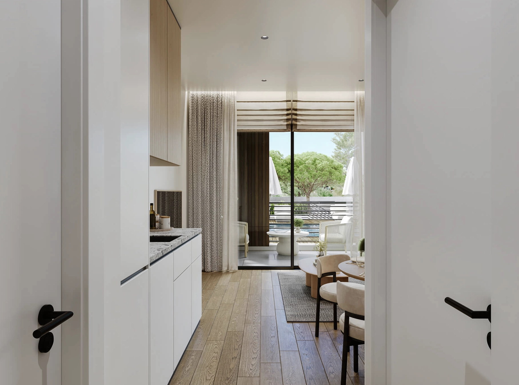 Large balcony doors extend the living area outdoors, providing a private space for relaxation or entertaining.