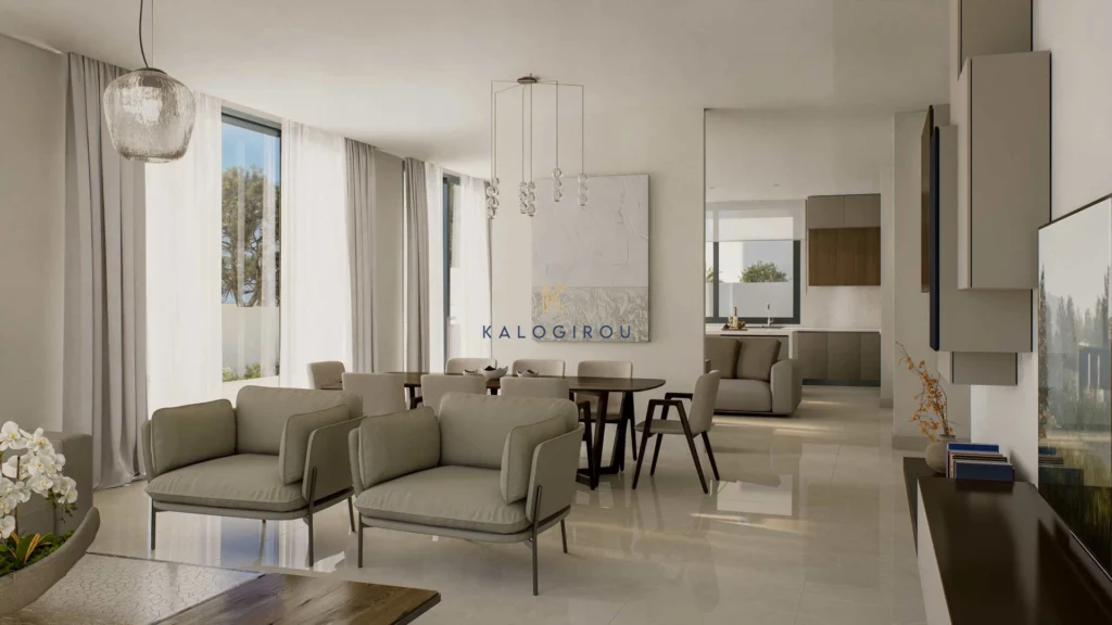 Villa for sale in Agios Athanasios area is designed with a contemporary and functional approach, offering every modern comfort. On the ground floor consists of a fully equipped space including gym, sauna, cava, storage room, mechanical room, utility/laundry area and one en-suite bedroom, ensuring practicality and flexibility for daily living or guest accommodation.