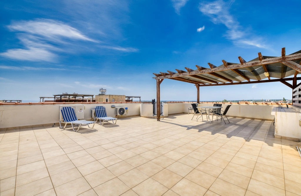 Two Bedroom Penthouse Apartment For Sale in Mazotos with Title Deeds Available This beautifully maintained penthouse apartment is offered fully furnished and ready for immediate occupation, making it an ideal choice for a permanent residence, holiday home, or investment opportunity. Situated in a well-kept complex just minutes from the beach and local amenities, the property combines comfort, convenience, and style. The apartment features an open plan living, dining, and kitchen area leading to a covered balcony perfect for relaxing or entertaining, there is also an impressive roof terrace with distant sea views. There are two well-proportioned double bedrooms with fitted wardrobes, a family bathroom, and a separate guest WC. The property is fully air-conditioned. Residents enjoy access to a communal swimming pool, while the property also benefits from a allocated covered parking bay and outdoor secure storage unit - Two Double Bedrooms with fitted wardrobes - Open plan Lounge, Kitchen, Diner - Fully Fitted Kitchen - Family Bathroom - Guest WC - Air conditioning - Fully Furnished - Roof Terrace: 80 m2 - Covered Balcony: 15 m2 - Covered area: 70 m2 - Communal Swimming Pool - Allocated Covered Parking - Storage unit Mazotos The village of Mazotos is built at a distance of 20 kilometres south westerly from the city of Larnaca on the coastal plain having, an average altitude of 35 meters. The landscape of the village has a general bent towards the sea. The altitude starts from 80 meters in the north westerly side of the village falling to an altitude of 35 meters near the settlement and it is decreased progressively towards the sea, which washes its southern side. Here they cultivated the vines (for wine and for table use), citrus fruits, olives, carobs, various species of vegetables (artichokes, tomatoes, cucumbers, watermelons, pumpkins and okras) and fig trees. The village of Mazotos is served with a very good transportation network. The name of the village emanates from the plant ‘Mazin’ and implies, the region was full of the wild Cypriot flora. The chapel of Virgin Mary of Petountas found near the sea, was built on the ruins of the city during the Roman years. During the last few years, tourism has developed as people have discovered the beauties of the community and have decided to live permanently there. ———— * Title Deeds Available * Furnished * Communal Swimming Pool * Air Conditioning * Allocated Covered Parking * Resale * Energy Efficiency TBC Mazotos Mazotos County: Larnaca Sale Type: For Sale Ref #: EPCC5922P
