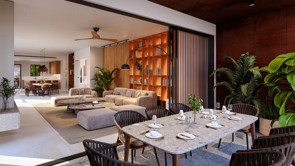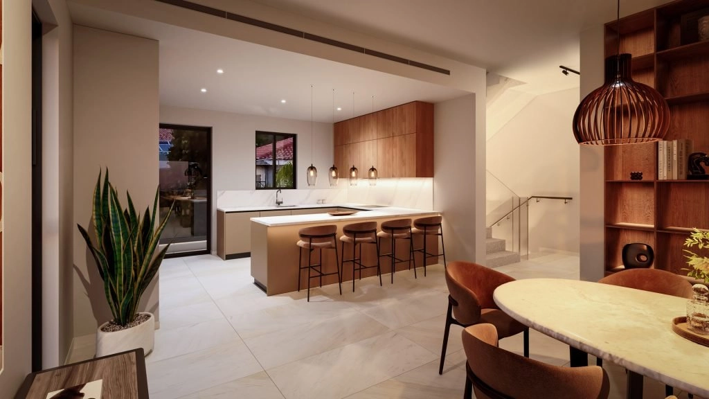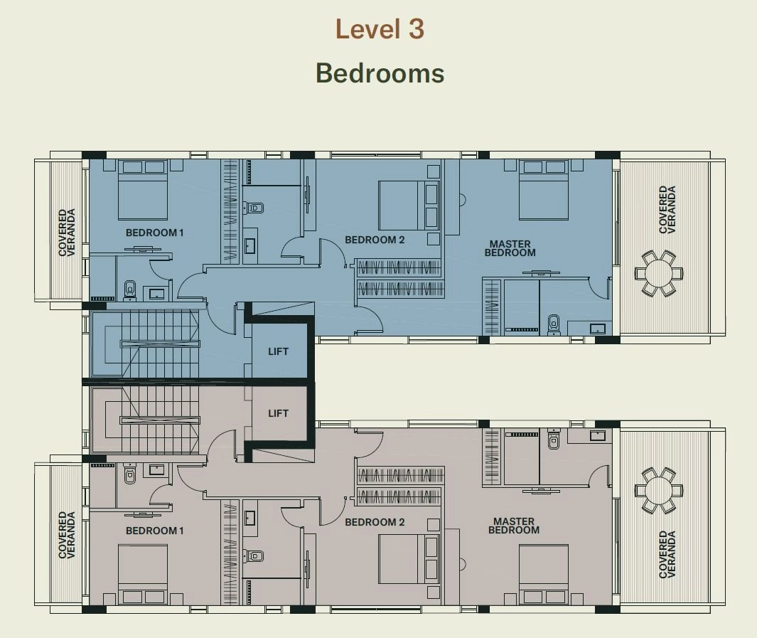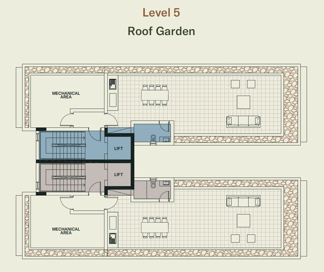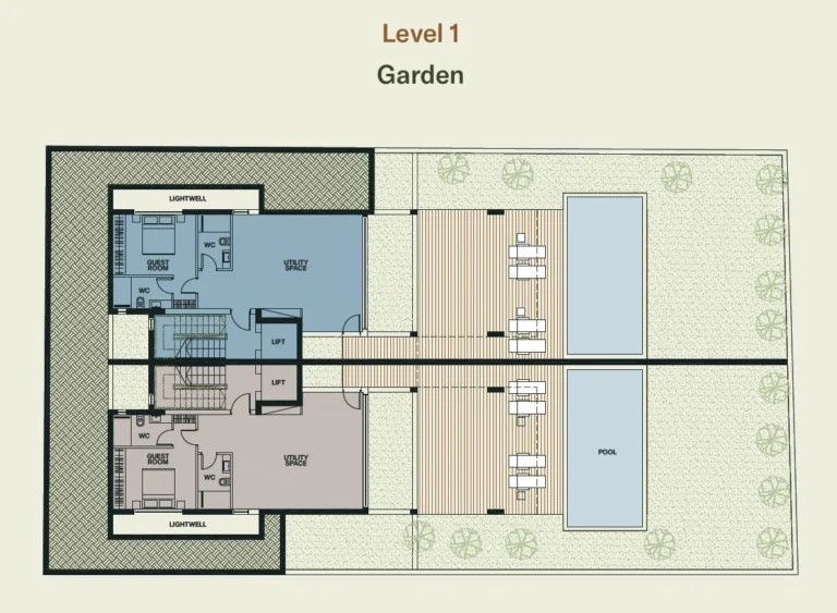 Spread over five levels, each villa offers a package of facilities and features offered at the highest possible specifications. Level 1 features the pool, garden, covered terrace, en-suite guest/maid’s room, large “flexible-use” utility room and guest bathroom. The covered parking and entrance lobby are located on Level 2 (street level). Level 3 is the bedroom level with three en-suite bedrooms of which one is the large master. Level 4 features the open-plan living, dining and kitchen areas with guest WC. Finally on Level 5 is the roof garden with pergolas and stunning views of the city and sea.