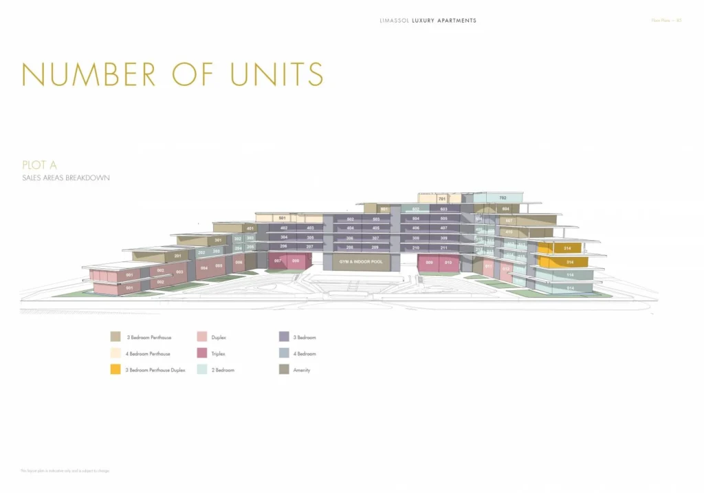 Apartment for sale in a luxury residential complex in the center of Limassol, in a prestigious and quiet area of the tourist zone, about 500 meters from the sea. The height of the structures reaches 7 floors. The structures of the buildings are designed in such a way that they encircle the landscaped garden located in the center of the project itself.There are also beautiful and spacious park areas for walking around the complex. The design idea is based on the principle of interaction of two elements – natural nature and the world created by man. The building has a stepped shape, in its visual concept resembles the silhouette of a grandiose yacht, where the terraces of each floor descend according to the cascade principle: from the highest point down.A striking element of the architecture is the wide balustrades that encircle each floor, thereby emphasizing the use of horizontal lines in the design. All residents will be able to enjoy the privacy of a gated complex with hotel infrastructure, including concierge service, SPA, outdoor swimming pool, indoor heated pool, gym, landscaped gardens, playground and a children’s club with a playroom.Main advantages:a landmark architectural project of one of the leading London bureaus;500 meters from the sandy beaches and infrastructure of the popular tourist area of Limassol;internal infrastructure of the hotel type: outdoor swimming pool, indoor heated pool, SPA, gym, concierge services, club locker room, underground parking, large landscaped gardens, playground for children;high ceilings (3.15 m);high-quality finishing materials (parquet, 2.4 m high doors, safe entrance doors, thermo-aluminum window frames, high-quality built-in furniture, plumbing);water underfloor heating and VRV air conditioning.