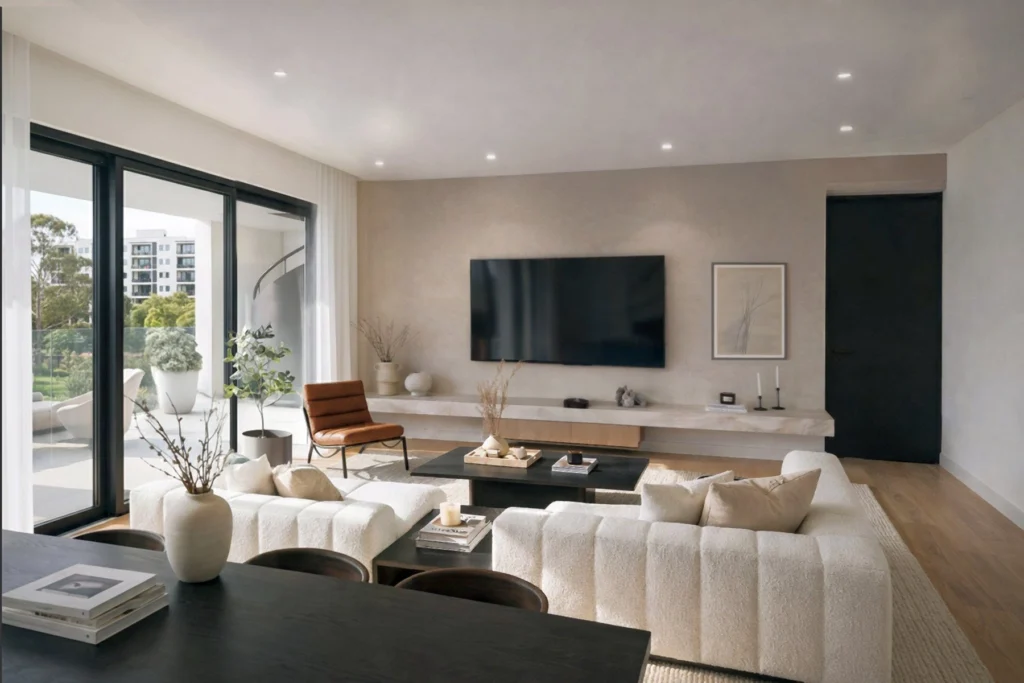 Interiors feature European-imported porcelain tiles, laminated bedroom flooring, and high-quality ceramic finishes. Bathrooms are fitted with refined European sanitary ware, complemented by electric heated towel rails. A VRV cooling and heating system ensures year-round comfort, with optional underfloor heating available.
