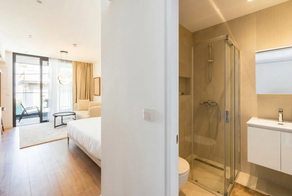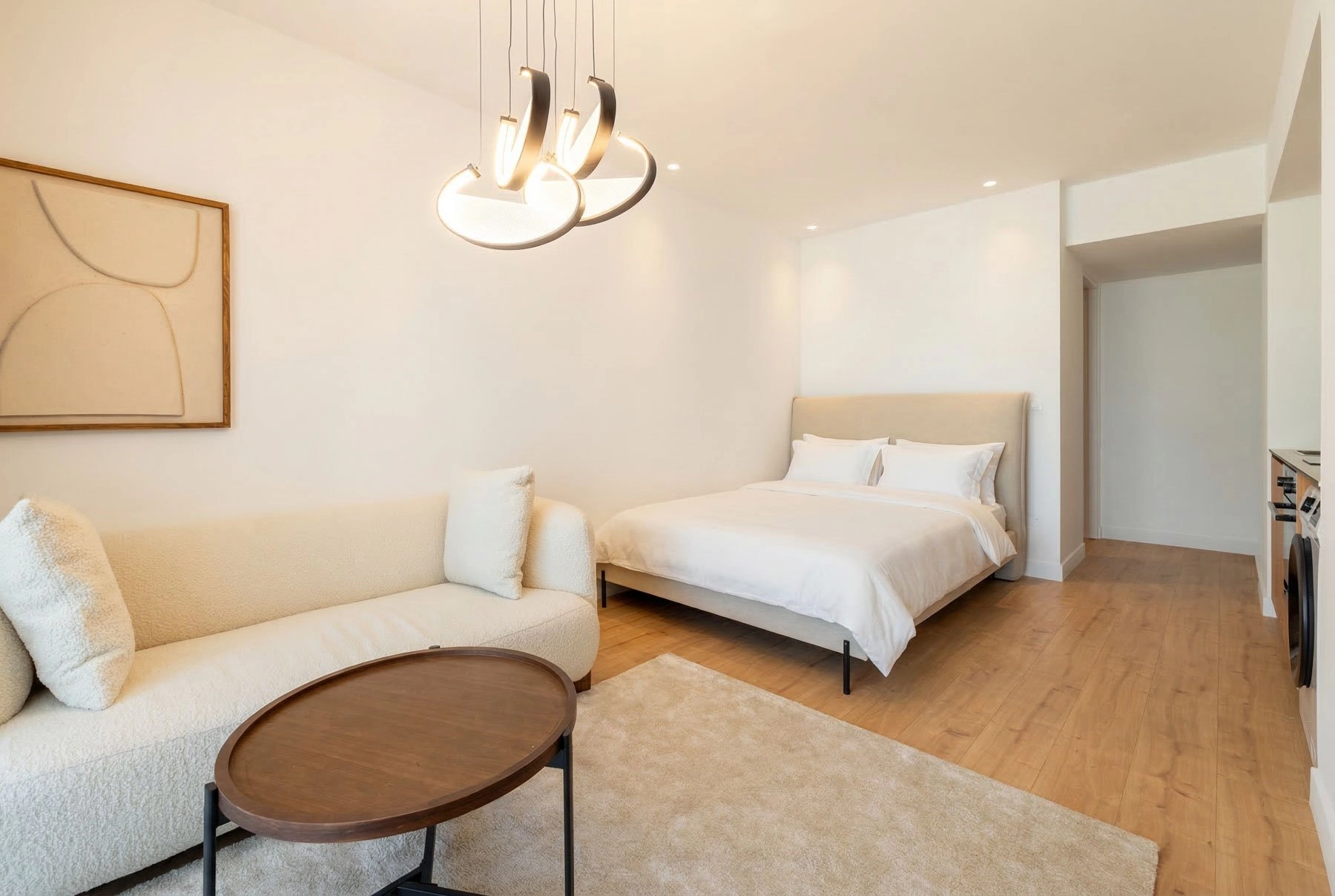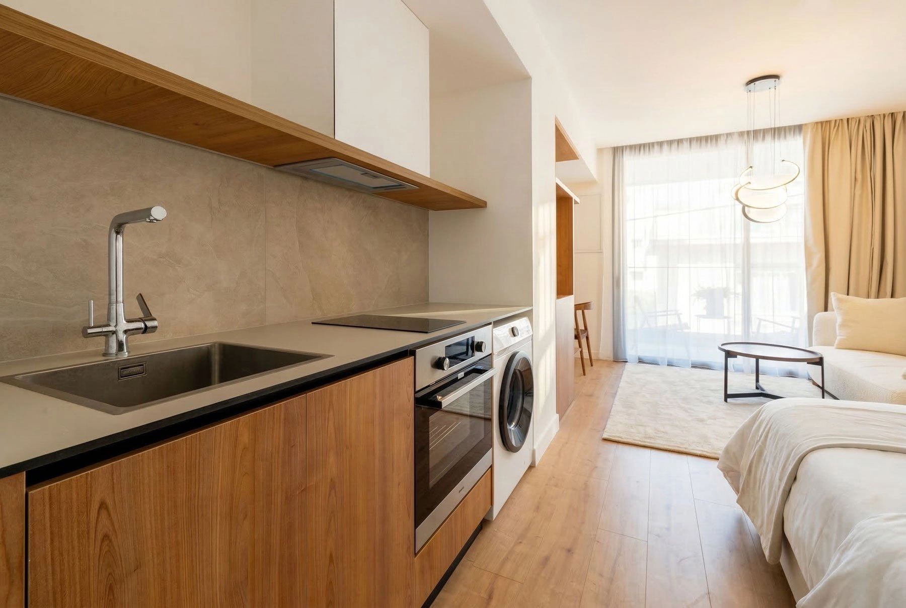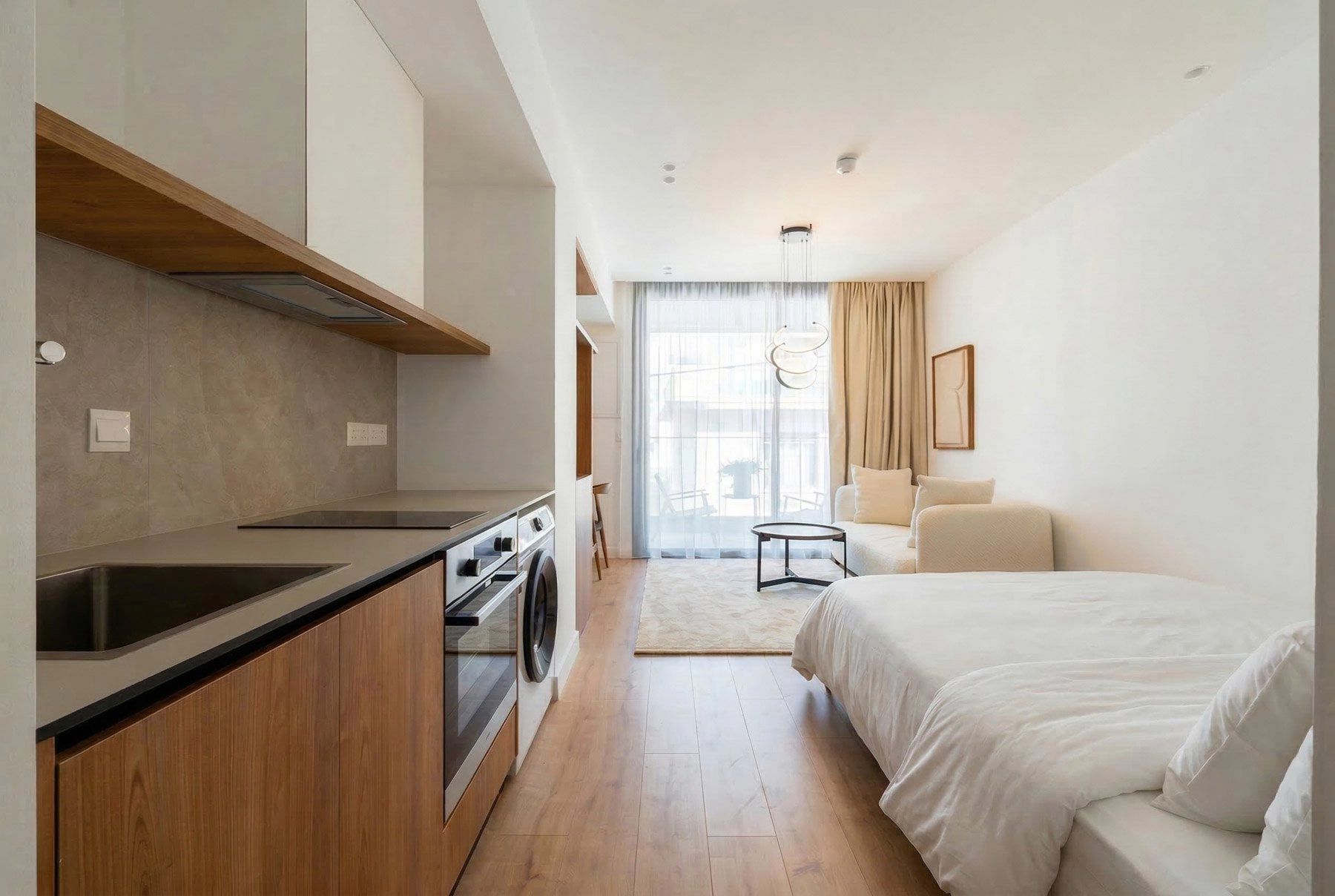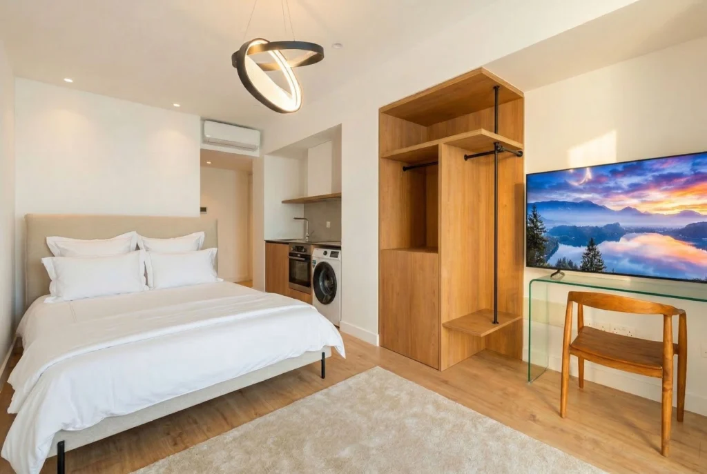 The studio is thoughtfully designed to maximize space and functionality, featuring a bright open-plan layout with a comfortable living and sleeping area, a fully equipped modern kitchen, and a sleek bathroom finished with high-quality materials. Contemporary furnishings and tasteful décor create a welcoming and move-in-ready environment. Residents benefit from access to premium on-site amenities, including a well-maintained swimming pool, a fully equipped gym, and secure underground parking. The building is modern, well managed, and offers a high level of privacy and convenience.