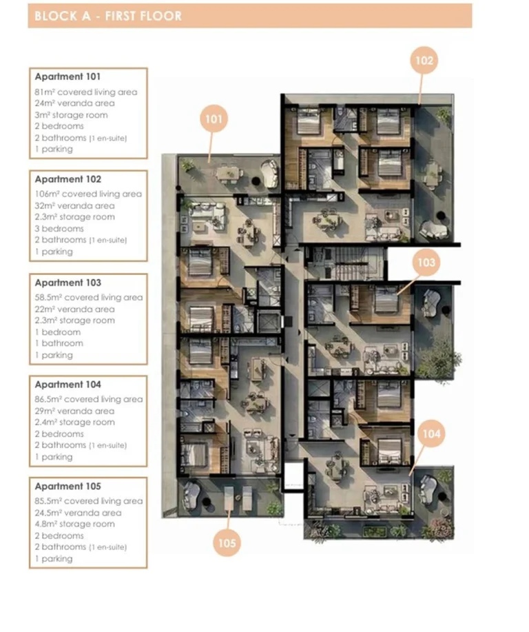 One Bedroom Apartment For Sale in Kiti, Larnaca – Title Deeds (New Build Process) A contemporary residential complex designed for modern living combines elegant architecture with comfort and practicality, creating a serene retreat in the heart of Kiti. Residents enjoy premium facilities including a gym, swimming pool, sauna, gym, lounge area and BBQ place. Where style meets tranquility, offering an elevated way of life. Set in the characterful area of Kiti, just outside Larnaca, these residences blends the serenity of open green landscapes with the comfort of refined modern living. The complex consists of two blocks totaling 25 apartments, including 1-bedroom, 2-bedroom, and 3-bedroom units, some of which feature private rooftop terraces with amenities such as a jacuzzi, lounge and BBQ area. Block A - 1 Bedroom with fitted wardrobes - Open plan living – dining – kitchen area - Family bathroom - Unfurnished - Optional premium furniture package - Optional electrical appliances package - Provision for air conditioning - Double glazing - Thermal insulation - Secure entry - High speed fiber optic internet - Communal swimming pool - Outdoor BBQ & lounge area - Communal gym - Communal sauna - Changing rooms - Storage - Covered parking - Internal 58 m2 - Veranda 12-22 m2 - Storage 2 m2 - Communal fees TBC - Close to all local amenities - 6 Minutes to the sea & nearest beach - 12 Minutes to the vibrant Mackenzie Beach - 15 Minutes to Larnaca Town Centre - 8 Minutes to Larnaca International Airport - Suitable for Cyprus Permanent Residency - Subject to VAT - Energy Efficiency A Kiti Kiti is found about 11 kilometers south-west of Larnaca. Villagers grow Vegetables, cereals, and a few fruit-trees are cultivated in the region. The small distance between Kiti and Larnaca, the good road connection and its remarkable development in agriculture contributed to its rapid population growth. The main village square which was recently revamped during a three-year project, has cafes, restaurants and a Museum of Culture. The unique church of “Panagia Aggeloktisti” houses a very rare 6th century mosaic of the Virgin and Child between two archangels, and is under the protection of UNESCO. The proposed marina will be in the Softades beach area which is also the island’s first and only designated beach for wind and kite surfing, and offers some of the best sea and wind conditions in the whole of the Mediterranean region. There are kite surfing schools/clubs located there if you fancy giving it a try. ———— * Title Deeds (New Build Process) * Communal Swimming Pool * Communal Gym & Sauna * Suitable for Cyprus Permanent Residency * Subject to VAT * Off Plan – Completion TBC * Energy Efficiency A Kiti Kiti County: Larnaca Sale Type: For Sale Ref #: KHX016N1/BlockA
