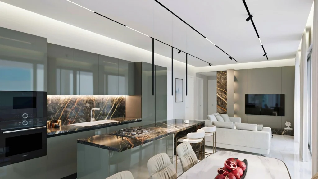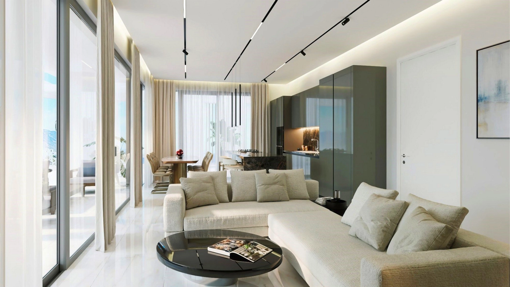 Each residence is crafted with meticulous attention to detail, showcasing sleek architectural lines and refined interiors. Floor-to-ceiling windows flood the spaces with natural light and open onto generous verandas with sea or city views. Interiors feature high-quality Italian ceramic and parquet flooring, custom-made kitchens with granite countertops, and designer bathrooms with walk-in showers and Ideal Standard fittings.
