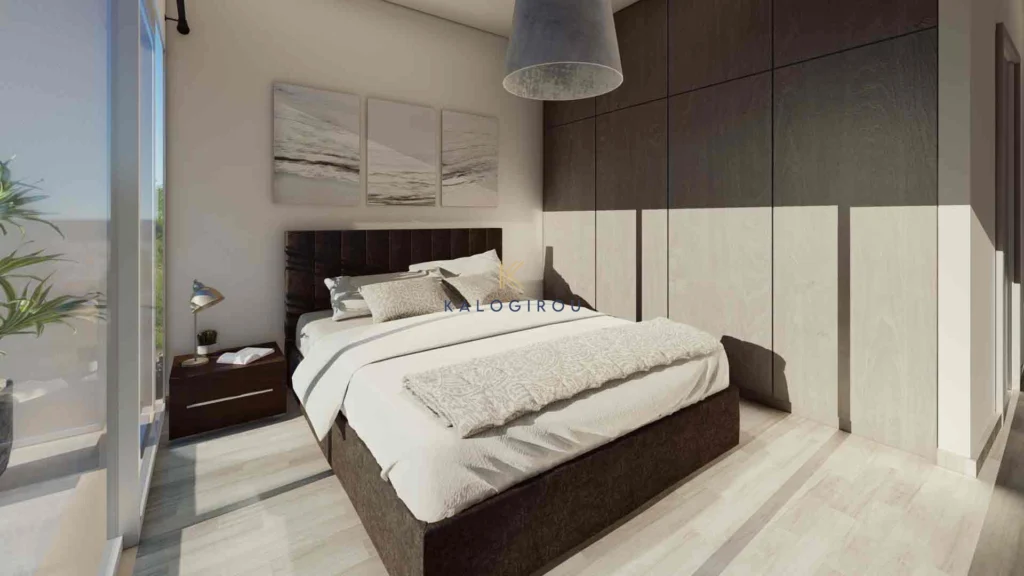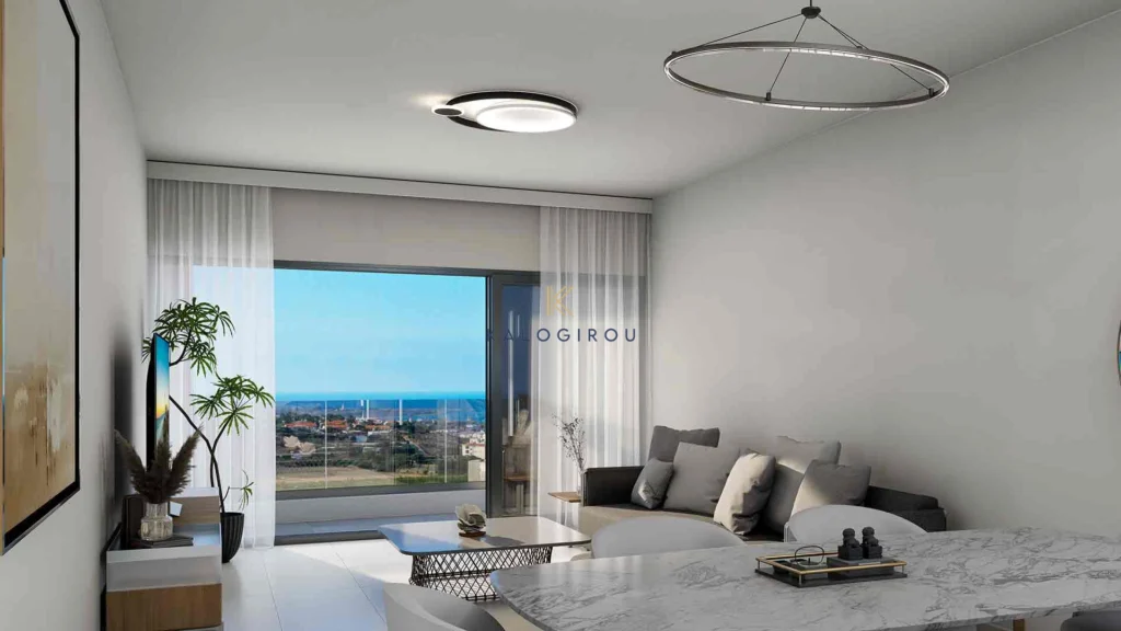 Marionette for sale in Paphos area. It consists of an open plan kitchen, dining, living area, a main bathroom & wc, 2 bedrooms, the main has en suite (shower) and covered veranda. The property has also a private parking space and storage.