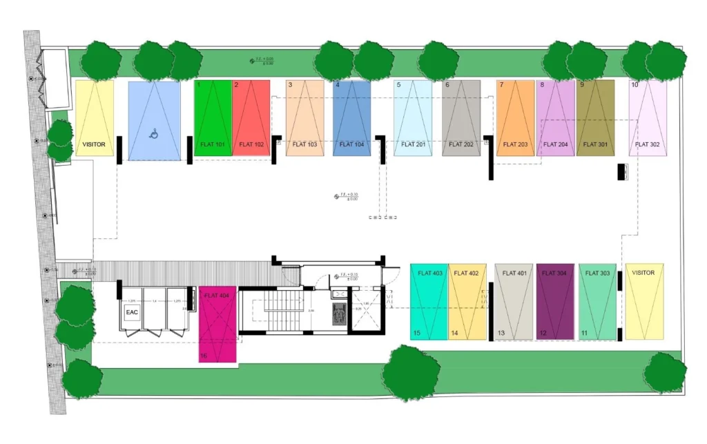 – One covered parking space for each apartment.