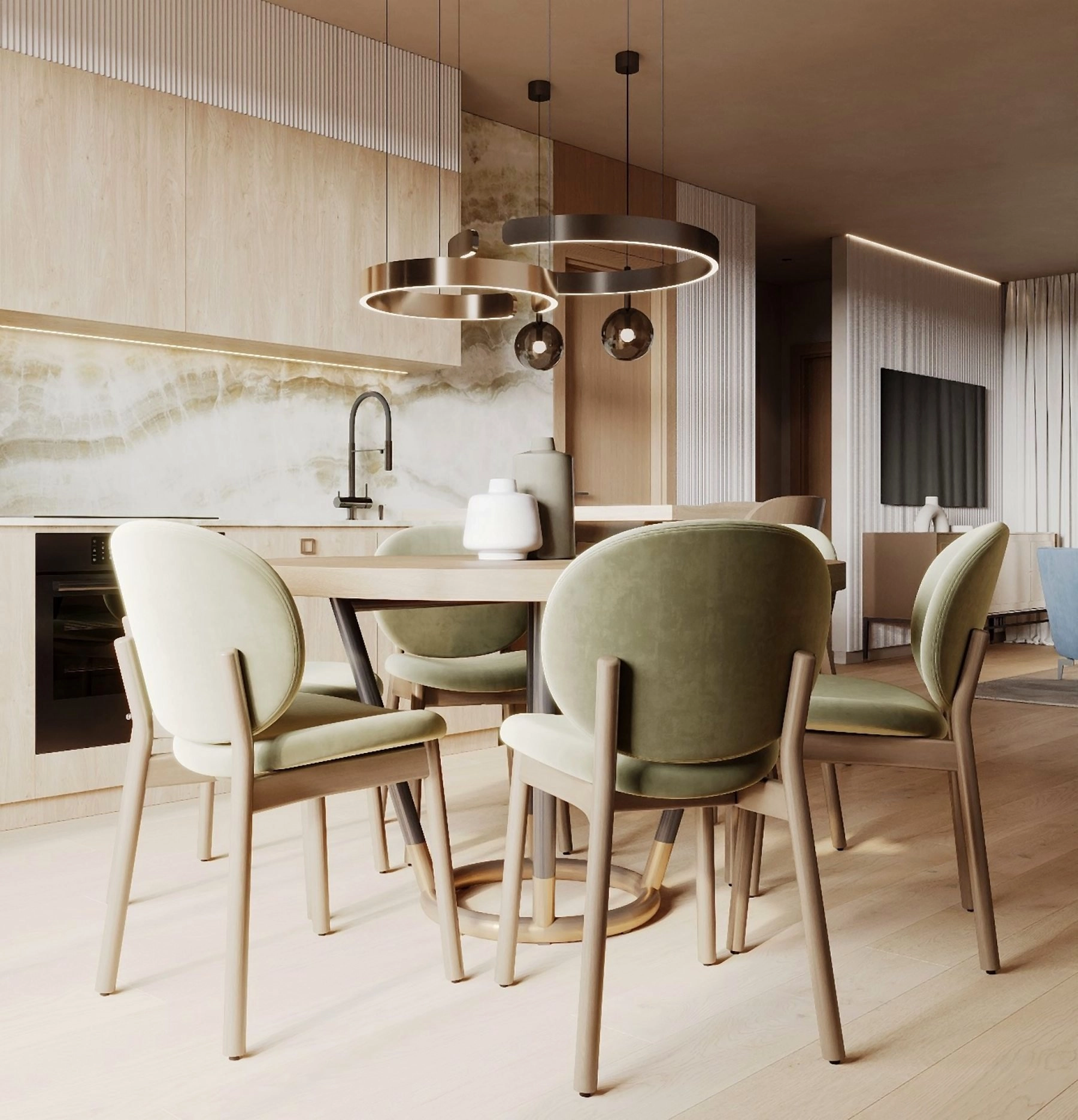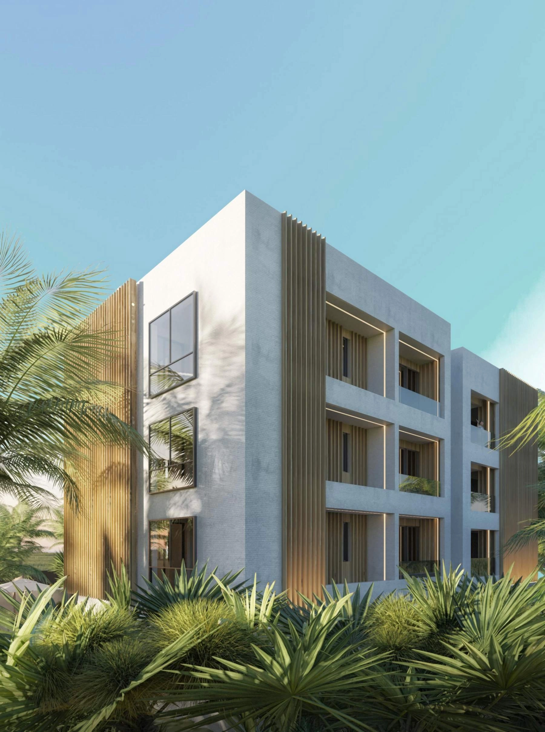 The architectural concept is complemented by clean, understated common areas and interiors inspired by natural textures and materials. Wood, stone, clay, wool, and linen shape a warm, tactile atmosphere that feels both contemporary and welcoming.
