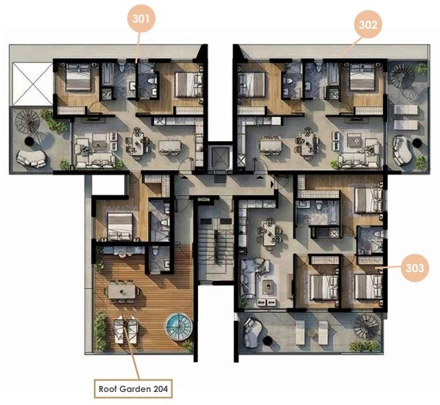 At its heart, a beautifully landscaped courtyard creates a private oasis for residents, featuring a swimming pool, a fully equipped gym, a sauna, and inviting green spaces designed for relaxation and wellbeing.