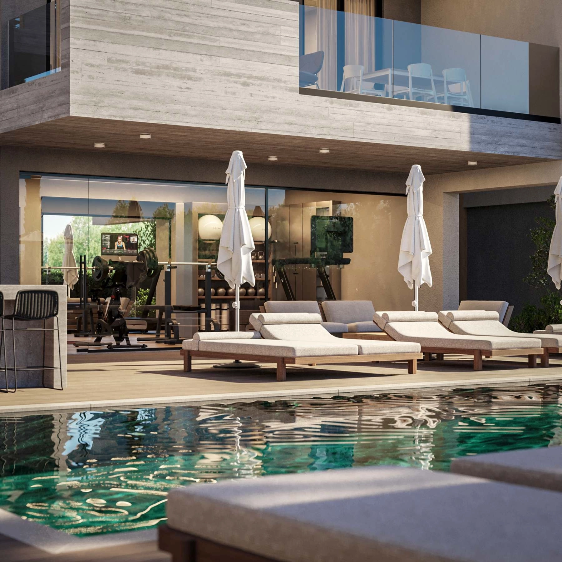 The apartments are designed with simplicity and elegance in mind. Bright interiors, clean lines, and warm materials create a calm and welcoming atmosphere, while functional layouts ensure comfort in everyday living. Spacious balconies open onto views of the pool, or surrounding landscape, naturally extending the living space outdoors.