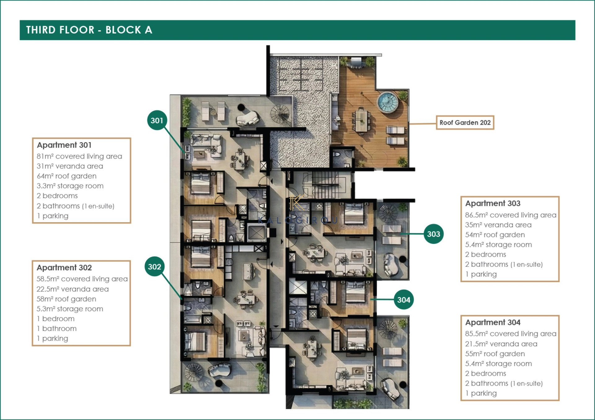 Second floor apartment for sale in Kiti area, Larnaca. It consists of an open plan kitchen-living-dining area, 3 bedrooms-master bedroom en suite, main bathroom, covered veranda and big roof garden. The roof garden offers open kitchenette, wc and Jacuzzi (provision). In addition, the apartment has allocated covered parking and storage room.