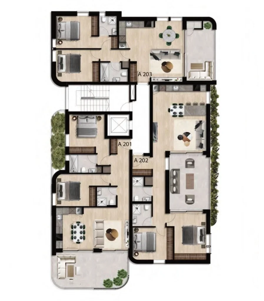 This modern residential project is designed for those who value architecture, comfort, and refined aesthetics. The building features an elegant contemporary façade with light tones, natural materials, and eco-friendly elements, creating a timeless and visually striking appearance.