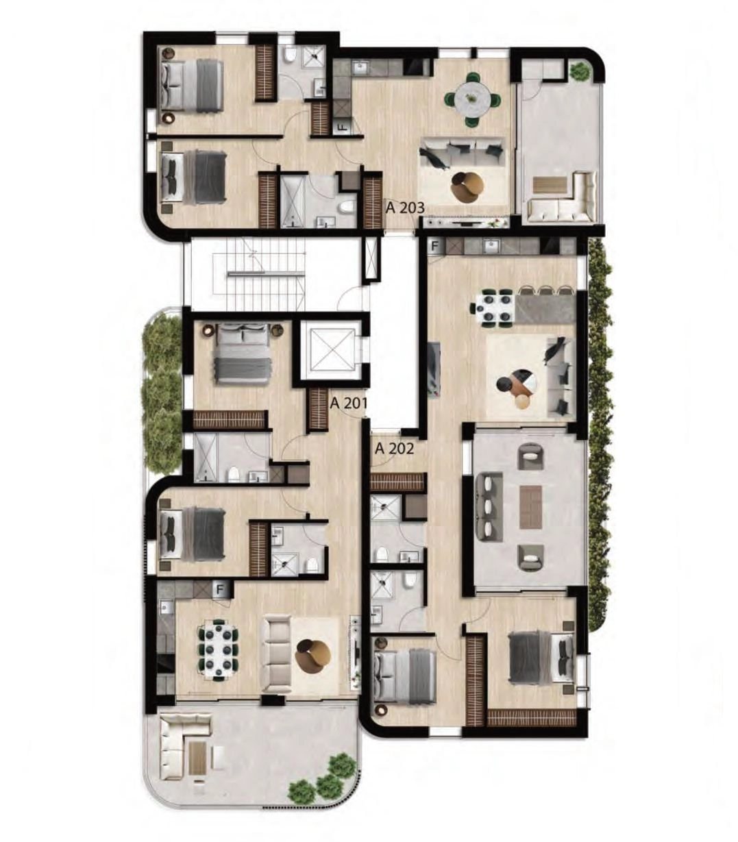 Carefully selected materials such as grafiato plaster and natural travertine ensure durability, texture, and a premium feel, while green landscaping on balconies enhances privacy and harmony with nature. Panoramic glazing and smooth architectural lines give the project a light, modern character combined with structural solidity.
