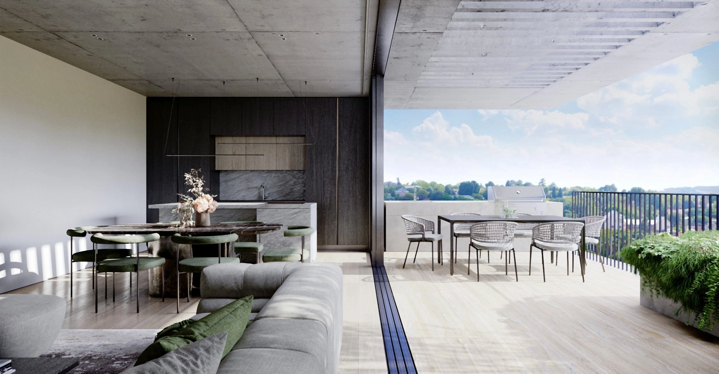 Generous covered verandas extend the living spaces outward, creating a seamless transition between interior and exterior zones. Selected residences benefit from expansive outdoor areas, while the rooftop level is designed as an additional lifestyle space, enhancing the overall living experience.