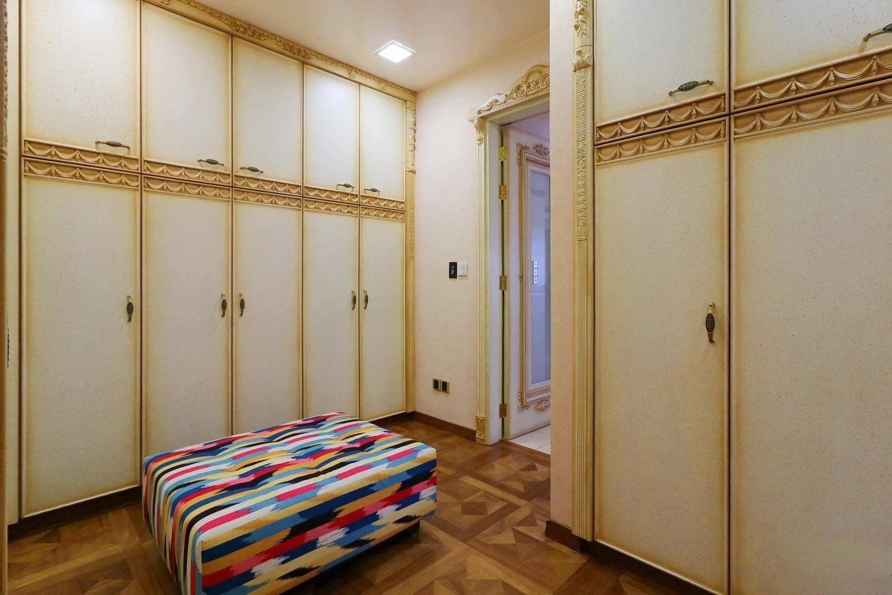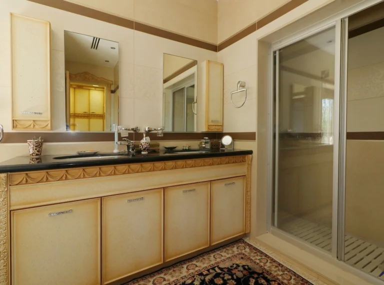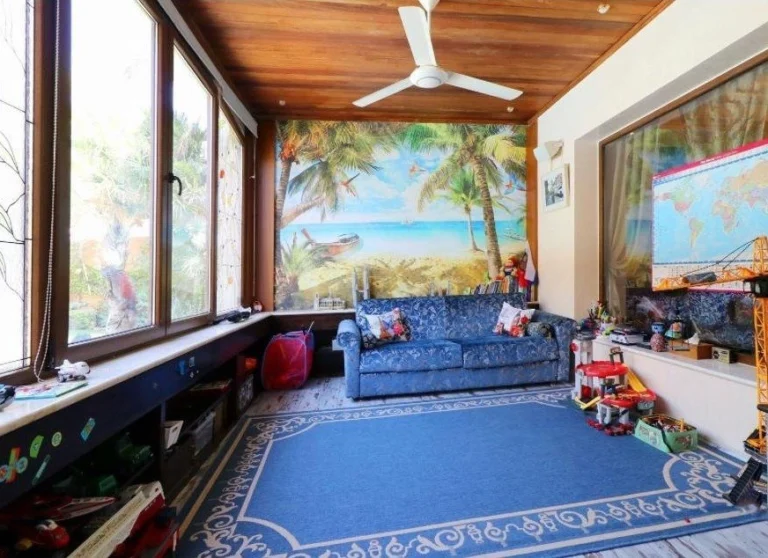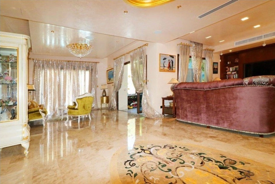 Arranged over three levels, the villa features spacious living areas, a large kitchen and dining area, five bedrooms all with en-suite bathrooms, a children’s play area, and an Otis elevator. The property also includes a separate guest house with independent utilities and a staff area in the basement with its own entrance, kitchen, and bathroom.