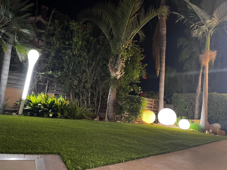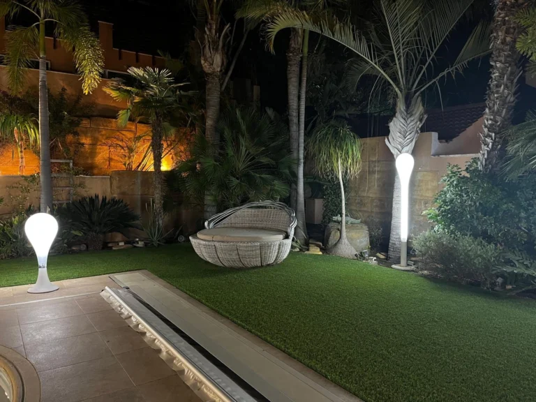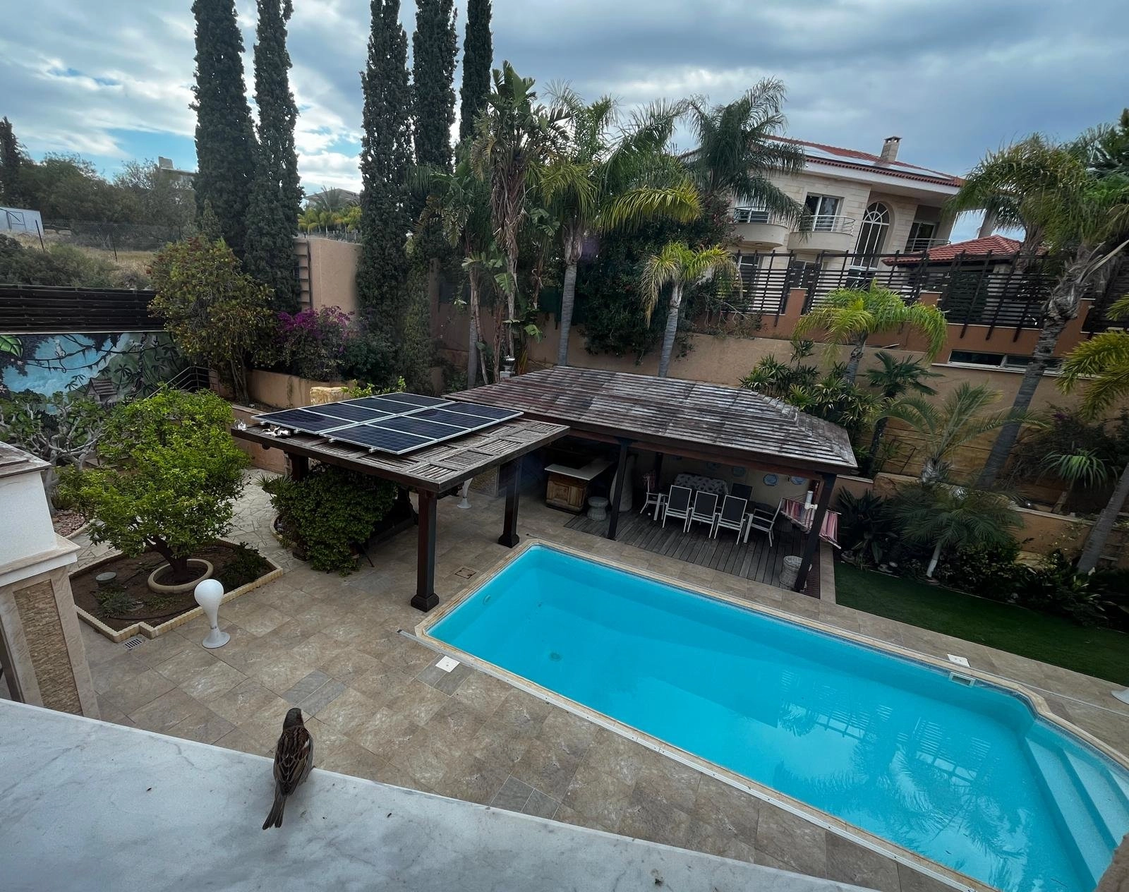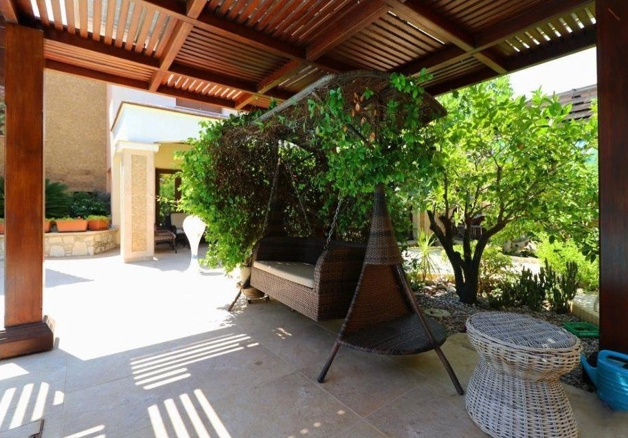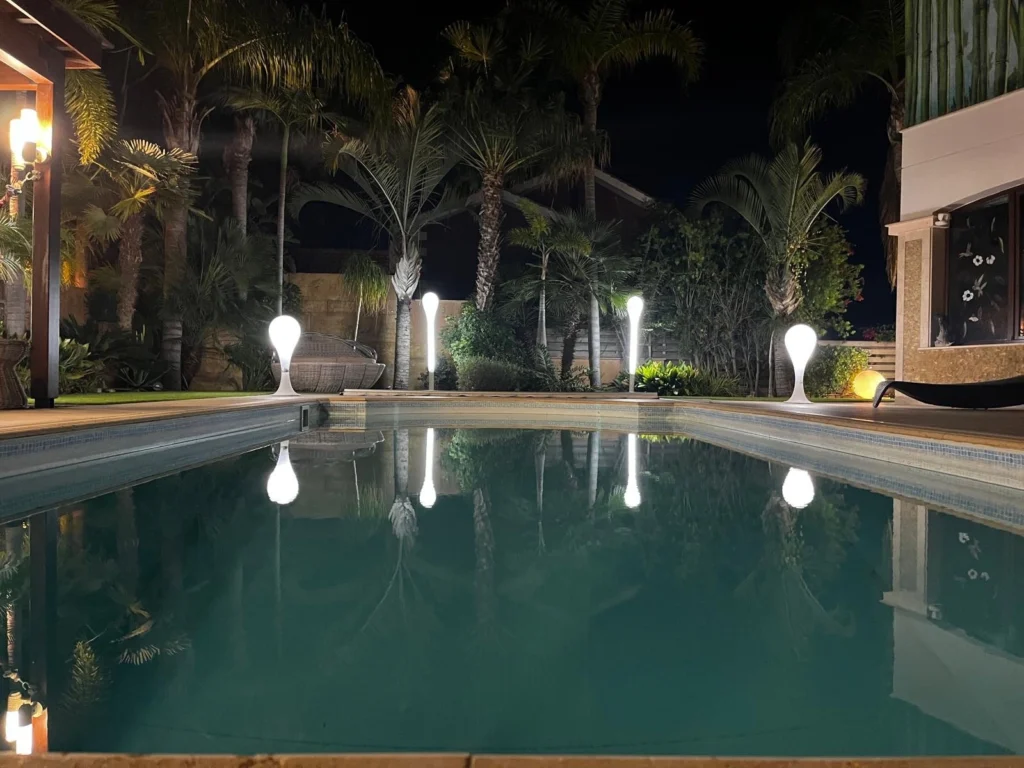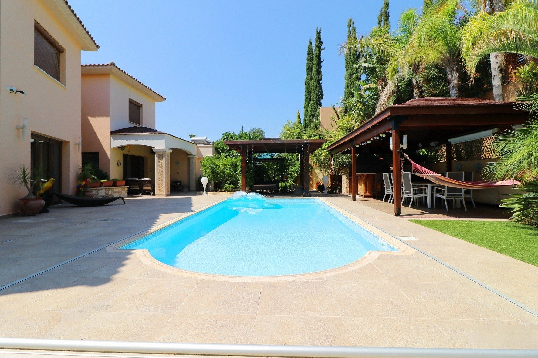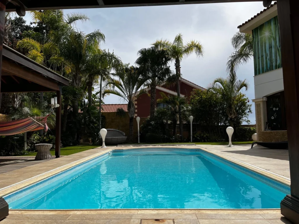 The outdoor area offers a heated 10×3 m swimming pool with solar system and electric cover, landscaped gardens with mature palm and fruit trees, a BBQ area with outdoor kitchen, and an outdoor projector for entertainment. The garden is irrigated via a private borehole, and the property is connected to the central sewage system.