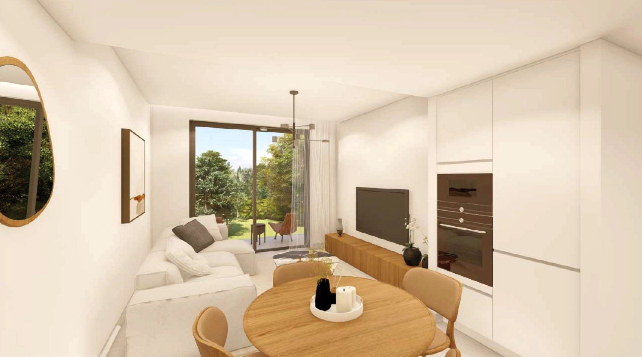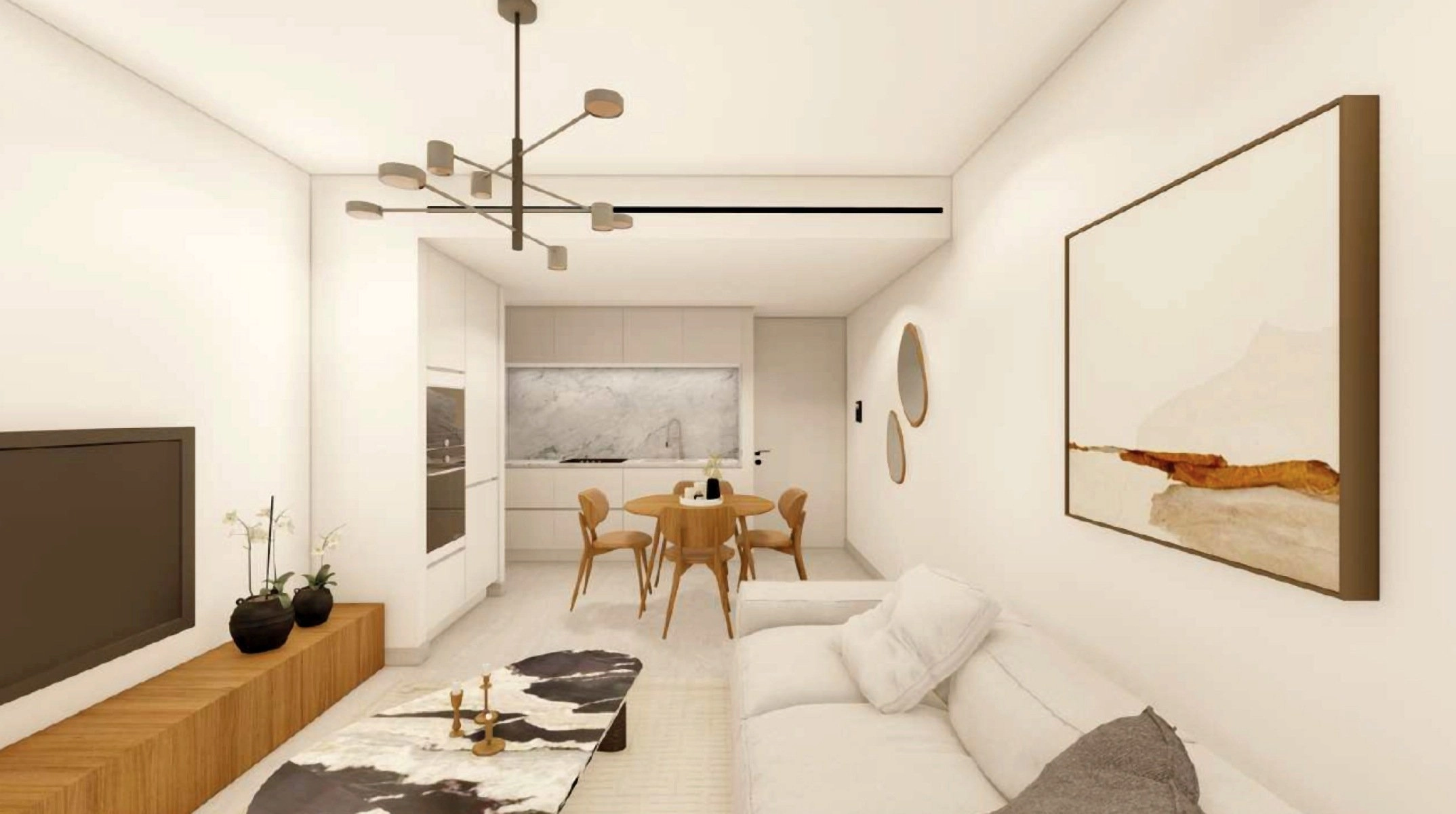 Each apartment is designed with an open-plan layout that maximizes light and space, creating a pleasant flow. Interiors feature quality ceramic flooring and refined finishes, while the kitchens are completed with techno-granite counters and clean, contemporary cabinetry. Bathrooms follow the same modern aesthetic, with full-height tiling adding a polished visual impression.