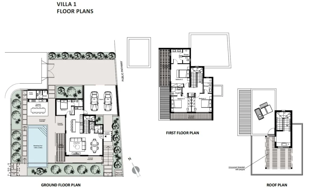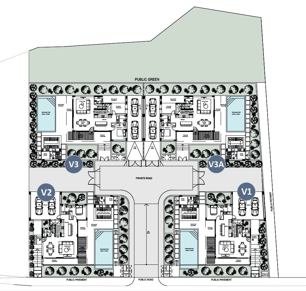 The villa is arranged around a private central road, ensuring a tranquil and secure environment while maintaining easy access to the public street. The villa features private parking, a landscaped garden, and a swimming pool, complemented by green spaces and a public green area to enhance the community’s serene atmosphere.
