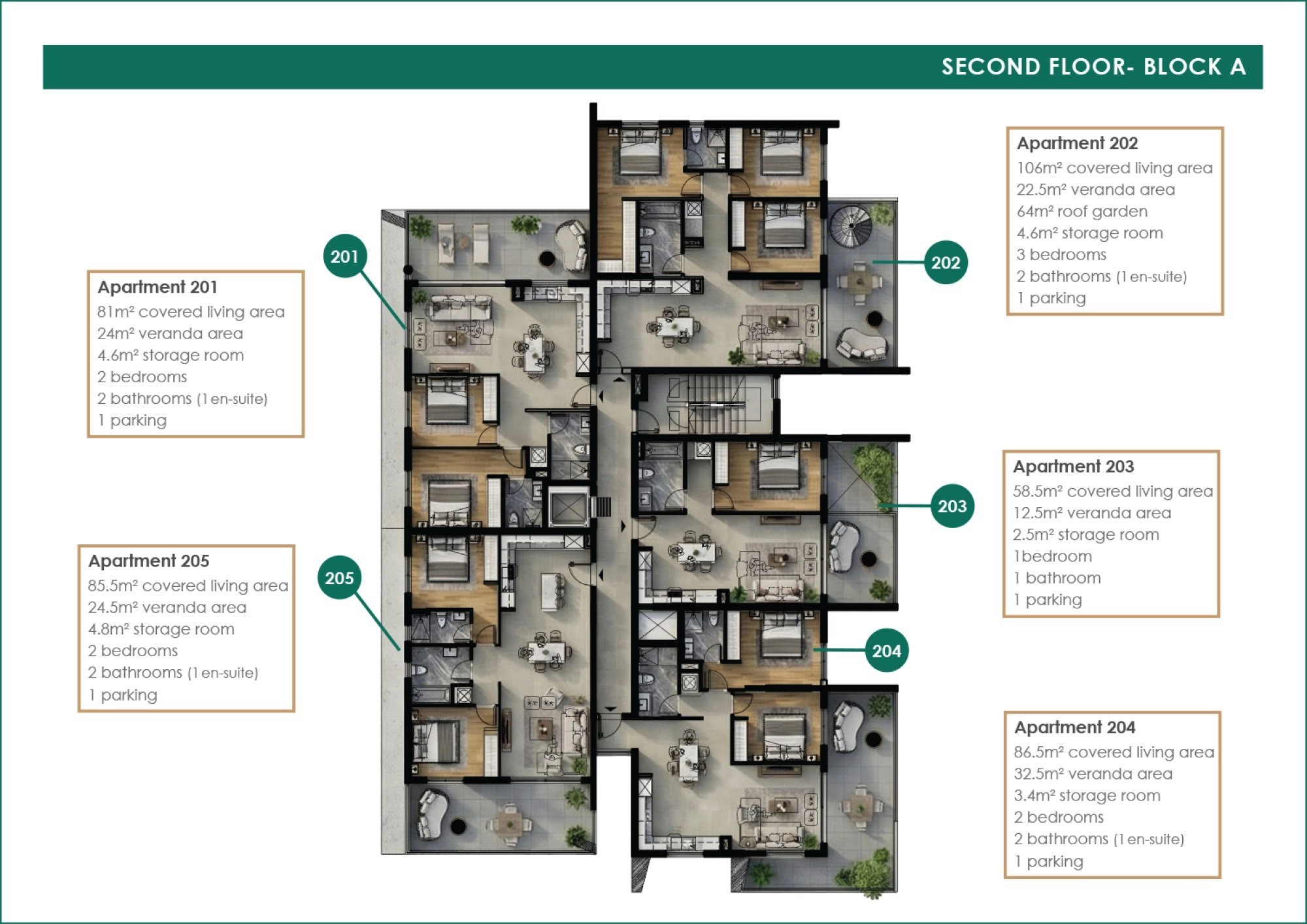 ✔ Private parking and storage for each residence